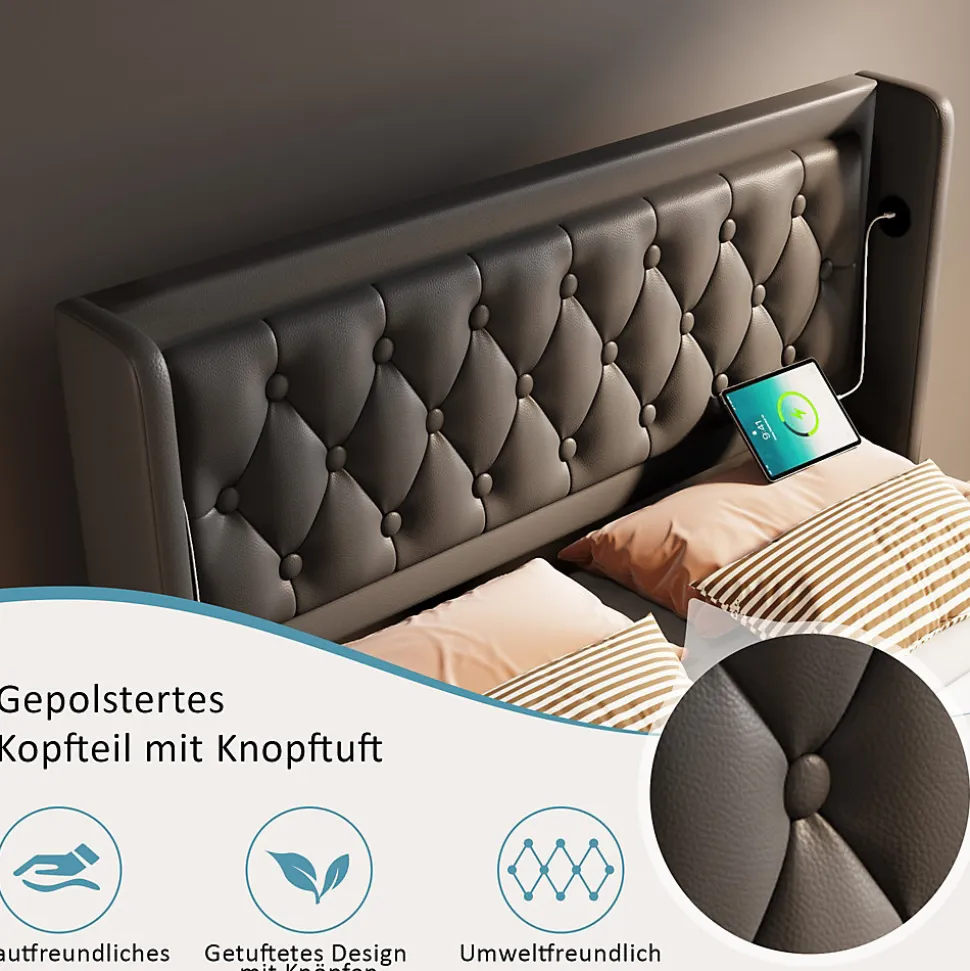 ▶ ▶ Détails ▶────────────────● Nom du produit : Lit double● Dimensions totales : 210 x 150 x 101 cm (L x l x H)● Matériau des panneaux : PU● Couleur : Noir● Poids maximal utilisateur : 300 kg / 660 LBS● Distance du tête de lit : 28 cm● Montage requis : Oui● Contenu du paquet : Cadre de lit + fonction de chargement● Design unique : Chargeur USB Type C intégré au tête de lit● Matelas applicable : 140×200 cm (matelas non inclus)● Poids brut/net (kg) : 47.03 / 41.62● Nombre de colis : 2● Matelas ● ▪ Dimensions totales : 140x200x25 cm (L x P x H)▪ Structure de noyau : Mousse froide 7 zones▪ Nombre de zones de couchage : 7▪ Dureté : H3▪ Poids corporel jusqu’à : 200 kg▪ Nombre de ressorts : 620 pièces▪ Position de sommeil : Sur le ventre / Sur le côté / Sur le dos▪ Convient aux personnes allergiques : Convient aux personnes souffrant d’allergies aux acariens▪ Housse du matelas : 100% Polyester (200g/m²)▪ Matériau de la housse : Tissu double 100% Polyester▪ Noyau : Ressorts ensachés + mousse ondulée▪ Entretien : Non spécifié▪ Nombre de pièces : 1▪ Livraison : Enroulé► Remarques ►※ Ce produit sera expédié en 3 colis. Ils peuvent arriver à des moments différents. Veuillez patienter.※ En raison de la mesure manuelle, un écart de 2 à 3 cm peut se produire.※ Toutes les images des produits sont prises avec les produits réels, mais en raison de l’influence de la lumière du soleil et d’autres facteurs, il peut y avoir de légères différences de couleur.※ Si vous avez des questions pendant l’installation, veuillez nous contacter dès que possible.