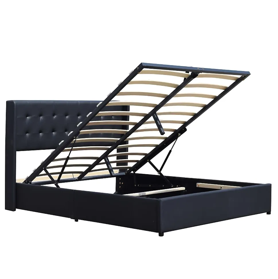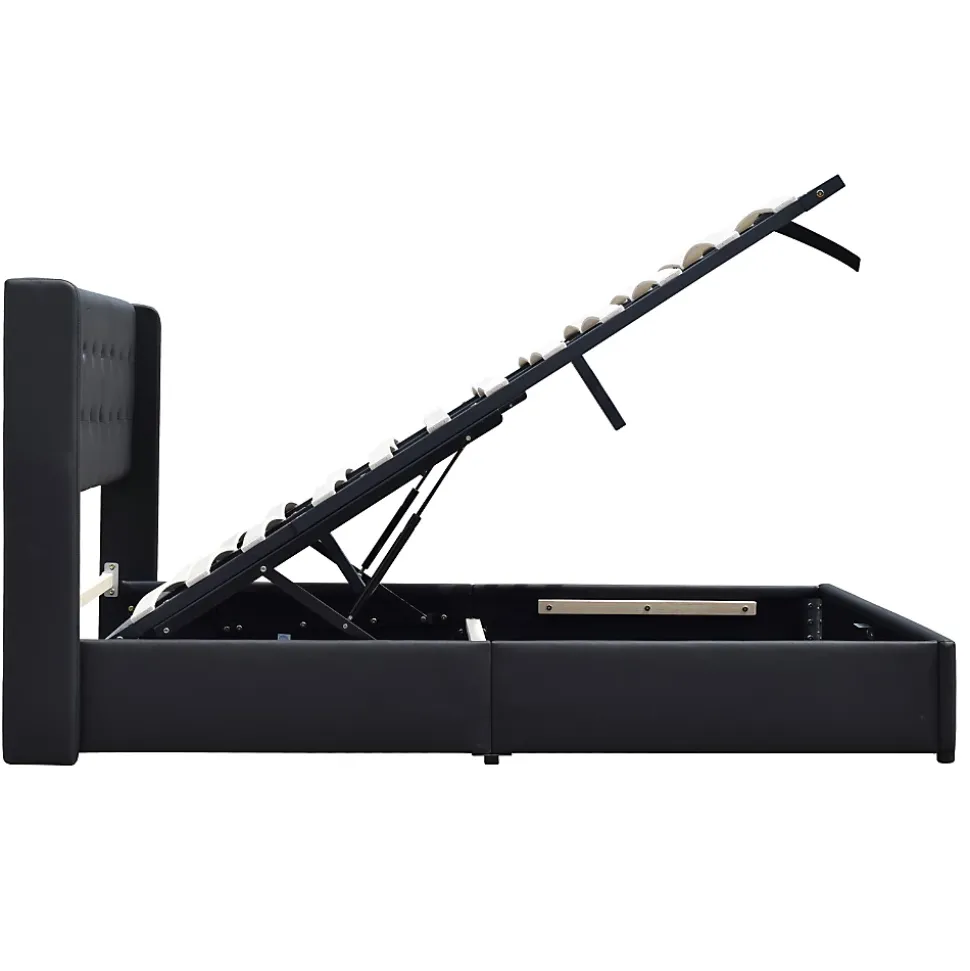 Lit Coffre dehoussable a Gaz + Sommier + tete de lit capitonnee hauteur 69 cm + 6 Pieds COULEUR: noirCaracteristiques:1 Lit simple en placage Panneau composite de fibres de bois à densité, avec des lignes epurees, ce lit sera un ajout apprecie aux chambres et au salon, egalement ideal pour les petits espaces, les enfants, les adolescent, les invites et les adultes.2 Un sommier avec de 14 resistantes et confortables Lattes en placage multiplis 5 cm de large et 0,9 cm d’epaisseur +3 Resistant aux chocs et aux rayures epaisseur du Metal +/- 1,2 mm. Tissu PVC : 100% polyvinyl chloride 220 gr/m2 rembourrage : mousse 100 % polyuréthane Simili etanche tres facile d’entretien4 Livraison rapide5 Hauteur du sommier 29 cm et Epaisseur des longs pans 3 cmS’il vous plait noter:* Le matelas n’est pas inclus. a monter soi-meme* Ne serrez pas les vis jusqu’a ce qu’elles soient completement assemblees. Les colis peuvent être separes dans le transport* Ne Pas utiliser ce produit si des pieces sont manquantes, endommagees ou usees.* Ne Pas permettre aux enfants de sauter sur le lit, car cela pourrait causer des dommages au chassis.* Veuillez verifier et serrer toutes les vis et boulons vers le haut tous les 3 mois pour assurer la stabilite.