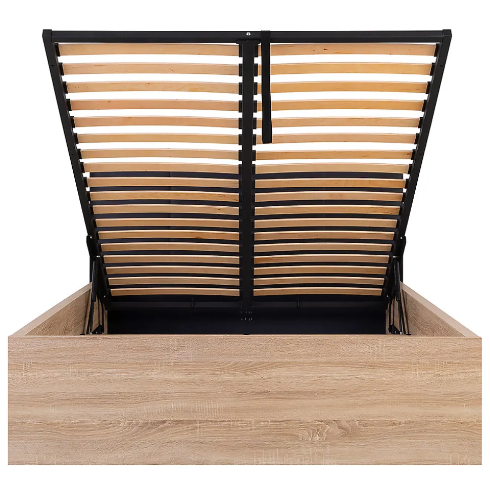 Lit coffre 140×200 tête de lit rembourrée sommier inclus Edwin Bois Clair et Noir