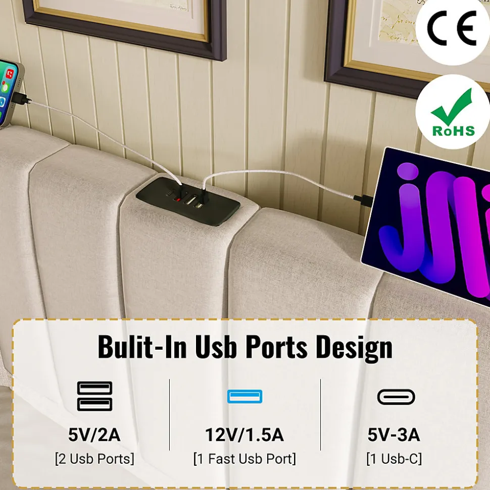 Lit Coffre 160 x 200 Cm – Lit Double avec LED et Charge USB-C – Métal, Lin, Bois Massif – Sans Matelas – Beige