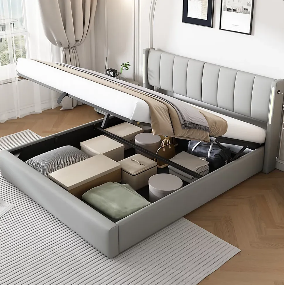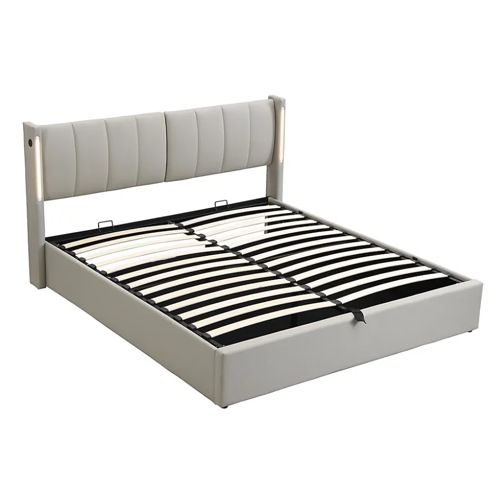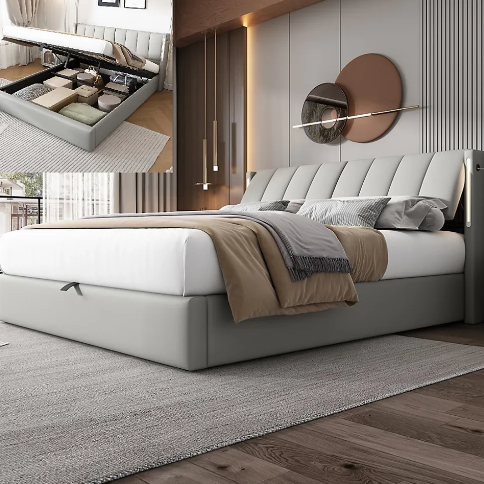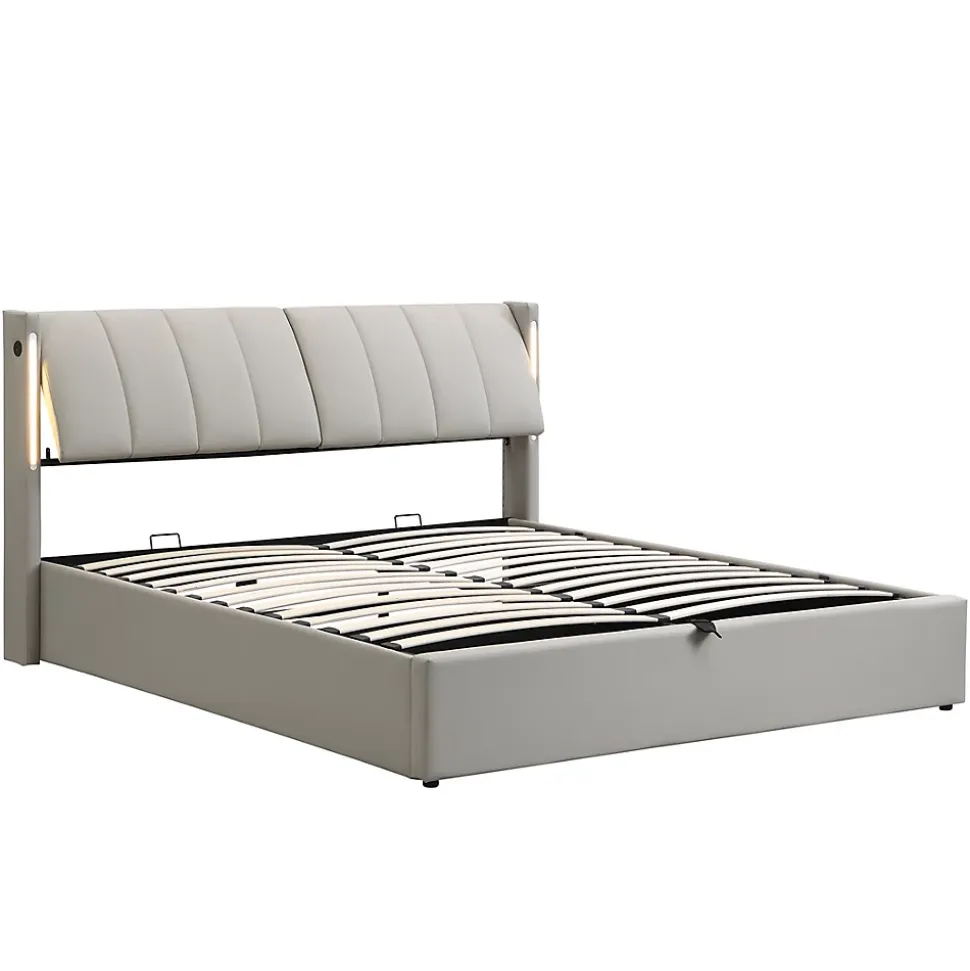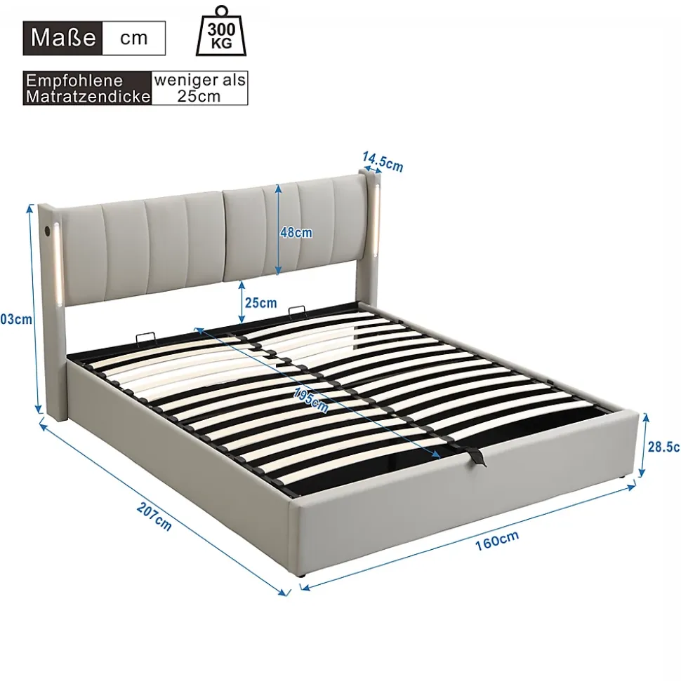 Design multifonctionnel – Ports USB intégrés, éclairage LED & dossier réglable en 3 positions pour un confort optimal. Contrôle intelligent – Lampe de chevet LED avec télécommande pour ajuster la luminosité & la fréquence de clignotement selon vos besoins. Imperméable & facile à entretenir – Revêtement en PU de haute qualité, résistant aux liquides & facile à nettoyer. Moderne & élégant – Design sophistiqué avec interfaces Type-C & LED, parfait pour un intérieur contemporain. Confort & stabilité – Inclinaison réglable de 0 à 30°, capacité de charge jusqu’à 300 kg, épaisseur de matelas recommandée : max. 28 cm.Détails du produitLargeur du couchage : 160 cmLongueur du couchage : 200 cmType de matelas : Sans matelasDétails des espaces de rangement : Espace de rangement sous le litLongueur : 207 cmLargeur : 160 cmHauteur : 103 cmPoids : 49 kgRemarque sur les dimensions : Toutes les dimensions sont approximativesCapacité de charge maximale : 300 kgRevêtement : PURemarques :Une légère marge d’erreur (1-2 cm) est possible en raison des mesures manuelles.De légères différences de couleur peuvent apparaître en fonction des réglages de l’écran & de l’éclairage.Livré en 2 colis, qui peuvent arriver séparément.Pour toute question concernant l’installation ou l’utilisation, notre service client est à votre disposition.