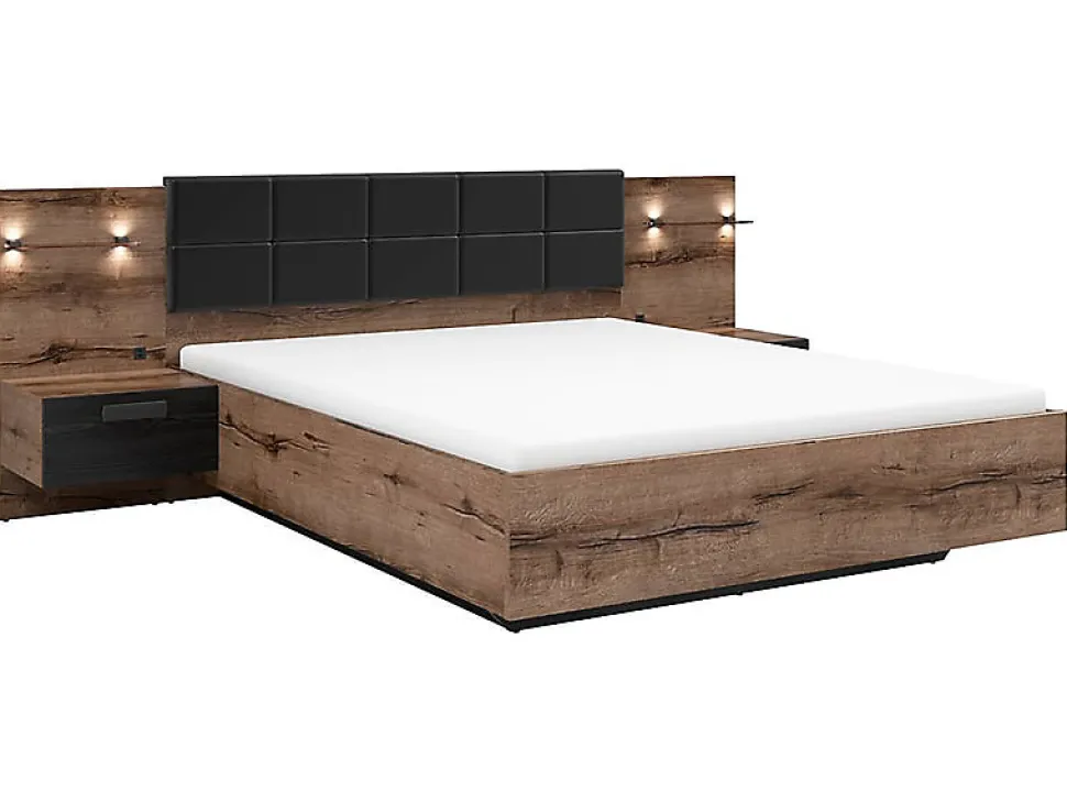 Large lit double 160 x 200 cm avec des tables de chevet intégrées dotées d’éclairage LED activable par simple pression sur un écran tactile doté d’un tiroir pratique, offrent un espace de rangement pour vos petits objets. La tête de lit, revêtue de similicuir noir matelassé, apporte une touche d’élégance au mobilier. Ce modèle moderne est équipé de ports USB , vous permettant ainsi de connecter votre téléphone à un chargeur et de l’avoir à portée de main.Dimension: Longueur 206 x Profondeur 165-265 x Hauteur 42-98,5 cm Structures : panneaux de particules, bois (lattes et insert pour le lit), film décoratif, chant en plastiqueFaçade : panneaux de particules, film décoratif, chant en plastique/chant simpleAccessoires : Composant de roulement TOP-LINE, charnières SLIDE-ON ’90 Alfa FGV avec frein, guides Quadro, poignées en plastique (noir mat), cadre en métal.Autres : appui-tête rembourré (en similicuir noir mat), éclairage, double connecteur USB.Matelas non inclusPoids : 156 kg
