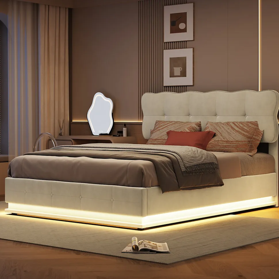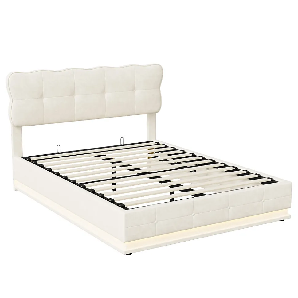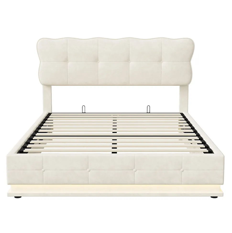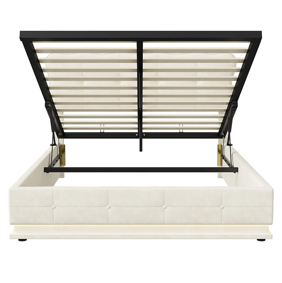 Éclairage LED : Les LED ajoutent une touche moderne à votre chambre à coucher. À l’aide de la télécommande, vous pouvez changer les couleurs et la luminosité depuis votre confortable fauteuil, ajustant ainsi l’ambiance à votre goût.Bien fabriqué : le cadre est en bois massif et en métal, pouvant supporter jusqu’à 300 kilogrammes, vous garantissant un sommeil paisible. Le matériau doux du lit offre non seulement une sensation de confort, mais réduit également efficacement les risques de blessures causées par des angles et des bords pointus pendant son utilisation par vous ou votre famille.Solide et durable : Ce lit de rangement est équipé d’un mécanisme hydraulique à double levage facile à utiliser, fabriqué en velours de haute qualité, et comprend une poutre de soutien centrale robuste ainsi qu’un cadre rembourré.Conception de rangemen : Ce lit dispose d’une fonction de rangement puissante. La conception de la barre de traction hydraulique vous permet de soulever facilement la surface du lit et de ranger des oreillers, des couvertures, des vêtements hors saison et de petits objets dans le coffre de lit, offrant ainsi un espace de rangement pratique.SpécificationsDimensions totales (l x L x H) : 164 x 204 x 110 cmCharge maximale : 300 kgMatelas inclus : NonMatériau de la plaque : Bois + Velours + MétalMatelas applicable (matelas non inclus) : 160 x 200 cm