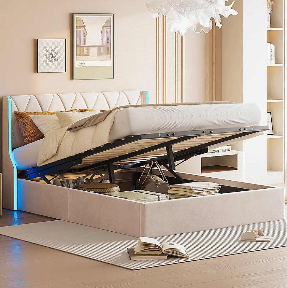 it coffre avec ledVous pouvez utiliser la télécommande ou le téléphone portable inclus pour régler la couleur et le mode de la lumière. Contrairement aux lumières LED traditionnelles, les lumières LED de ce lit hydraulique peuvent changer au rythme de la musique, créant une variété d’atmosphères différentes pour votre chambre.lit 2 personne avec sommierLa surface du lit coffre est en tissu velours doux, agréable au toucher et doux pour la peau. L’aspect beige est élégant et ajoute une atmosphère chaleureuse à votre maison.lit 160×200 avec sommierLa fonction la plus pratique de ce lit double est l’espace de rangement sous le lit. Il adopte une conception à tige pneumatique pour soulever facilement la surface du lit, ce qui facilite le rangement, vous aidant à garder la pièce bien rangée et vous permettant d’économiser de l’espace. au milieu Les pieds offrent un soutien supplémentaire au lit, rendant l’ensemble du lit plus stable et solide, créant ainsi un bon environnement de sommeil pour vous.lit adultelit coffre 160x200Détails du produit :- Matériau : velours + bois + métal.- Dimensions (l x p x h) : 213 x 169 x 105 cm.- Poids : 49 kg.- Charge maximale : 300 kg.- Surface de couchage de 160 x 200 cm (sans matelas).- Nombre de lamelles : 12.Remarques :- Et l’ensemble du produit est livré en 2 paquets et peut arriver à des jours différents. Veuillez être patient pour la livraison complète.- Les coussins, les couvertures et les objets de décoration représentés sur la photo ne sont pas inclusContenu de l’emballage :1 lit de 2 place1 mode d’emploi (français non garanti)