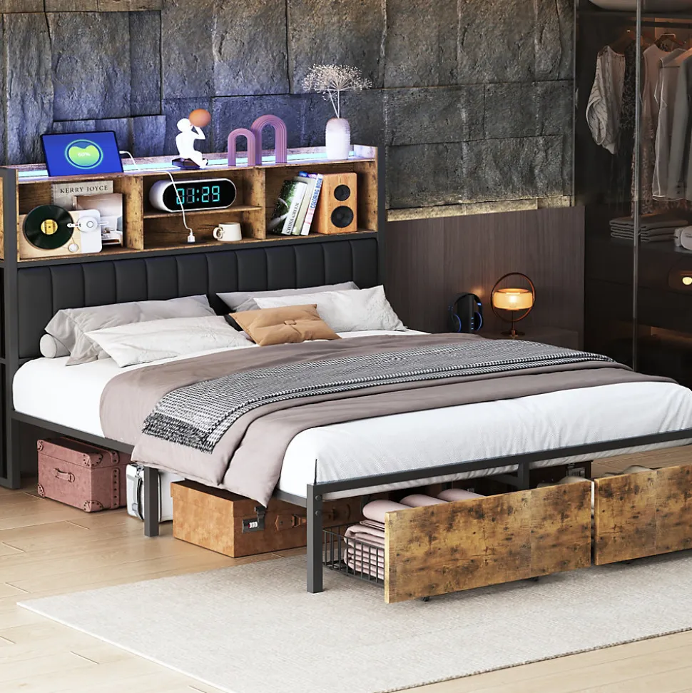 Design pratique avec rangements – La tête de lit intègre un grand espace de rangement en panneaux, idéal pour organiser vos livres, accessoires ou objets du quotidien. Confort optimal – Tête de lit rembourrée en simili cuir (PU), offrant un appui agréable et élégant pour vos moments de lecture ou de détente. Éclairage LED intelligent – Bande lumineuse LED multicolore intégrée à la tête de lit, contrôlable par télécommande ou via application mobile (téléchargeable grâce au QR code sur la bande). Espace de rangement supplémentaire – Deux tiroirs fonctionnels au pied du lit, parfaits pour vêtements, linge de lit ou accessoires divers. Connectivité moderne – Prise USB et prise européenne intégrées à la tête de lit, pour recharger facilement vos téléphones, tablettes et autres appareils électroniques. Remarque :Matelas applicable : 160×200 cm (hors matelas). Ce lit sera expédié en deux lots. En raison de contraintes logistiques, les livraisons peuvent ne pas être simultanées. Merci de votre patience.