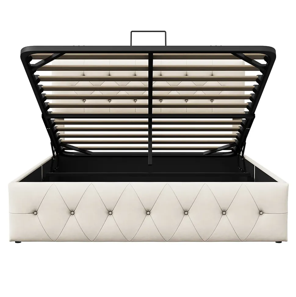 Description du produitCe lit double rembourré apporte chaleur et confort à votre chambre grâce à son design élégant et sa fonctionnalité pratique. La surface du lit est recouverte d’un tissu de velours doux et confortable, confortable et riche en texture, ajoutant une touche de luxe moderne et haut de gamme à la chambre. Il y a un coffre de rangement hydraulique sous le lit, qui peut être ouvert facilement et offre un espace de rangement spacieux. Qu’il s’agisse de literie saisonnière, de vêtements ou de nécessités quotidiennes, il peut être correctement rangé, rendant l’espace de la chambre plus rangé et ordonné. La conception globale prête non seulement attention à la beauté, mais prend également en compte la praticité et le confort. C’est un choix idéal pour ceux qui recherchent un style de vie moderne et simple, et offre le compagnon le plus attentionné pour votre repos quotidien.Détails du produit :- Matériau : velours + bois + métal.- Dimensions (l x p x h) : 202.2 x 167 x 122.5 cm.- Poids : 47 kg.- Charge maximale : 300 kg.- Surface de couchage de 160 x 200 cm (sans matelas).- Nombre de lamelles : 12.Contenu de l’emballage :1 lit.1 mode d’emploi (français non garanti).Remarques :- Et l’ensemble du produit est livré en 2 paquets et peut arriver à des jours différents. Veuillez être patient pour la livraison complète.- Les coussins, les couvertures et les objets de décoration représentés sur la photo ne sont pas inclus