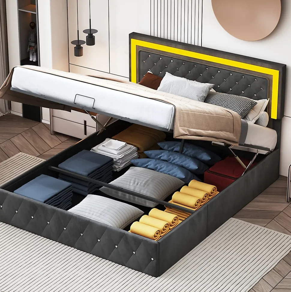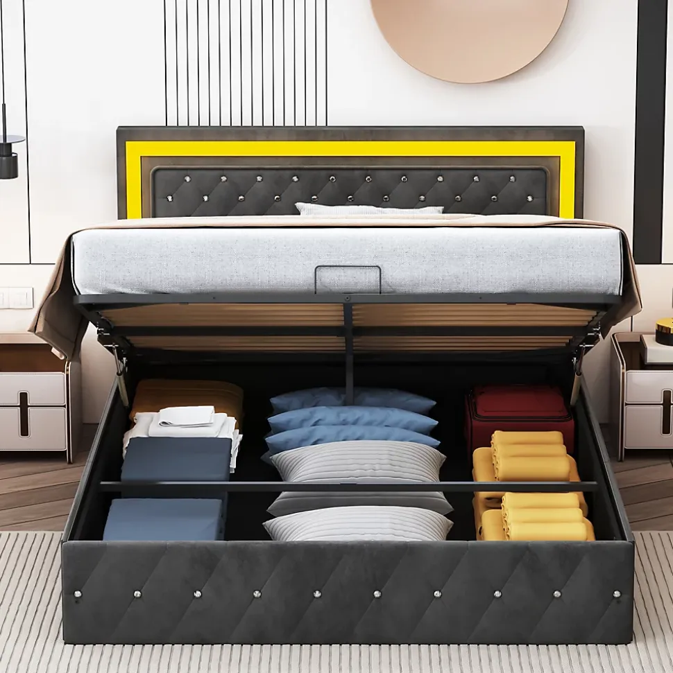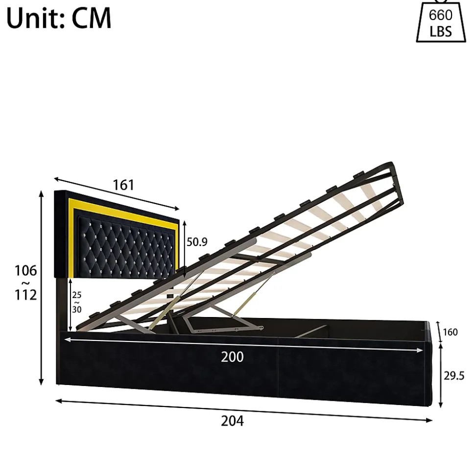 design de stylela tête de lit réglable (106-112) vous offre un soutien plus stable et plus confortable de la tête et du dos. Le lit rembourré est fabriqué en velours, qui est doux pour la peau et vous offre une expérience de sommeil parfaite. Le gris rend le lit moelleux plus résistant aux salissures.apparence exquiseavec sa construction robuste et son design élégant avec son motif à boutons, sa tête de lit et ses ornements, il est résistant et confère une atmosphère raffinée à votre chambre à coucher.cadre de lit hydrauliquele design du levier hydraulique vous permet de soulever facilement la surface du lit et de placer des objets dans le cadre de lit. Le coffre de lit est revêtu d’un non-tissé noir qui repousse l’humidité et garantit que les objets stockés sous le lit restent propres. Les ressorts d’arrêt à l’extrémité du lit facilitent le soulèvement du sommier et contribuent également à la fixation du matelas.ambiance sensuellecontrôlez facilement les lumières du cadre de lit led à l’aide de la télécommande fournie ou de la commande smart wireless. Plongez dans la douce lueur des lumières led intégrées, qui ajoutent de l’élégance et créent une atmosphère paisible dans la chambre à coucher. Réjouissez-vous du plaisir visuel que les lumières créent dans votre chambre.instructions de montageune installation est nécessaire. Le produit fourni contient des instructions détaillées et les outils de montage nécessaires. données techniquestaille : 141x204x106-112cmtype de sommier : un sommier à lattes est inclus dans la livraison.type de matelas : sans matelasdétails des espaces de rangement : espace de rangement sous le litlargeur du plan de couchage : 160 cmlongueur du plan de couchage : 200 cmpoids : 55 kgcontenu de la livraison :- 1 x lit rembourré led- 1 x instructions
