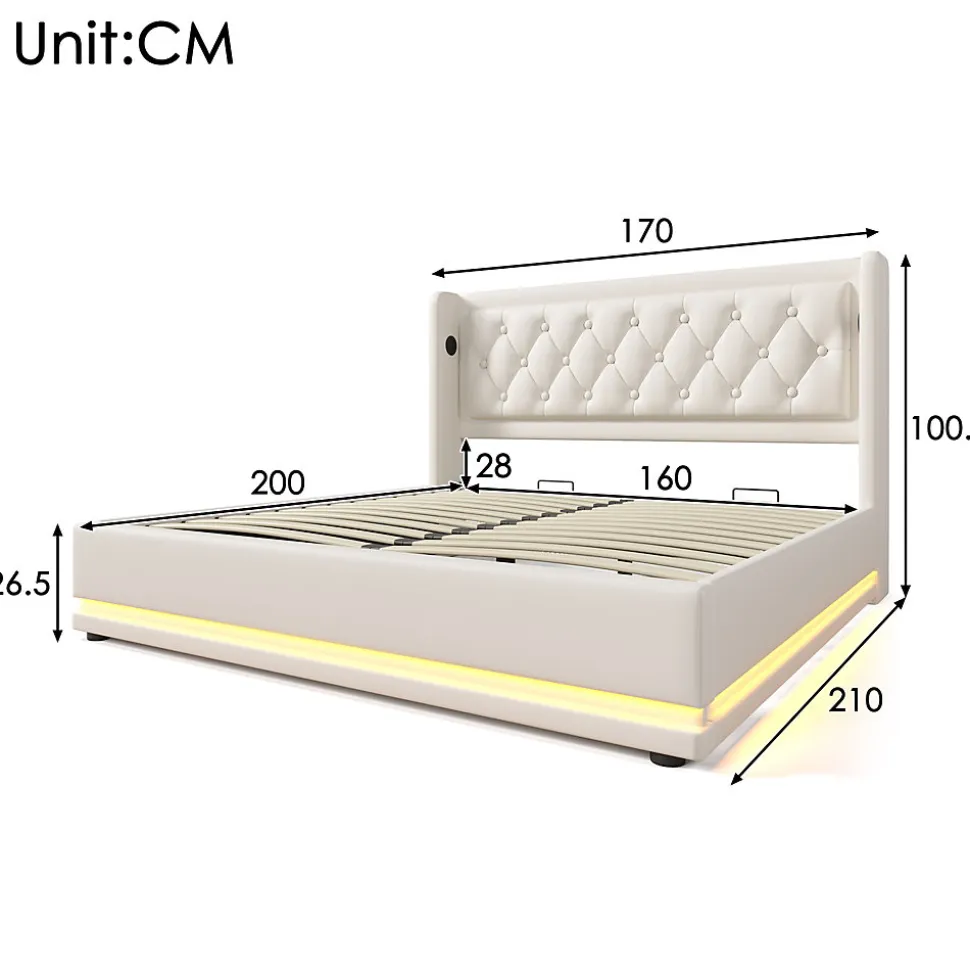 ▶ ▶ Détails ▶────────────────● Nom du produit : Lit double● Dimensions totales : 210 x 170 x 101 cm (L x l x H)● Matériau des panneaux : PU● Couleur : Blanc● Poids maximal utilisateur : 300 kg / 660 LBS● Distance du tête de lit : 28 cm● Montage requis : Oui● Contenu du paquet : Cadre de lit + fonction de chargement● Design unique : Chargeur USB Type C intégré au tête de lit● Matelas applicable : 160×200 cm (matelas non inclus)● Poids brut/net (kg) : 54.02 / 48.72● Nombre de colis : 2► Remarques ►※ Ce produit sera expédié en 2 colis. Ils peuvent arriver à des moments différents. Veuillez patienter.※ En raison de la mesure manuelle, un écart de 2 à 3 cm peut se produire.※ Toutes les images des produits sont prises avec les produits réels, mais en raison de l’influence de la lumière du soleil et d’autres facteurs, il peut y avoir de légères différences de couleur.※ Si vous avez des questions pendant l’installation, veuillez nous contacter dès que possible.