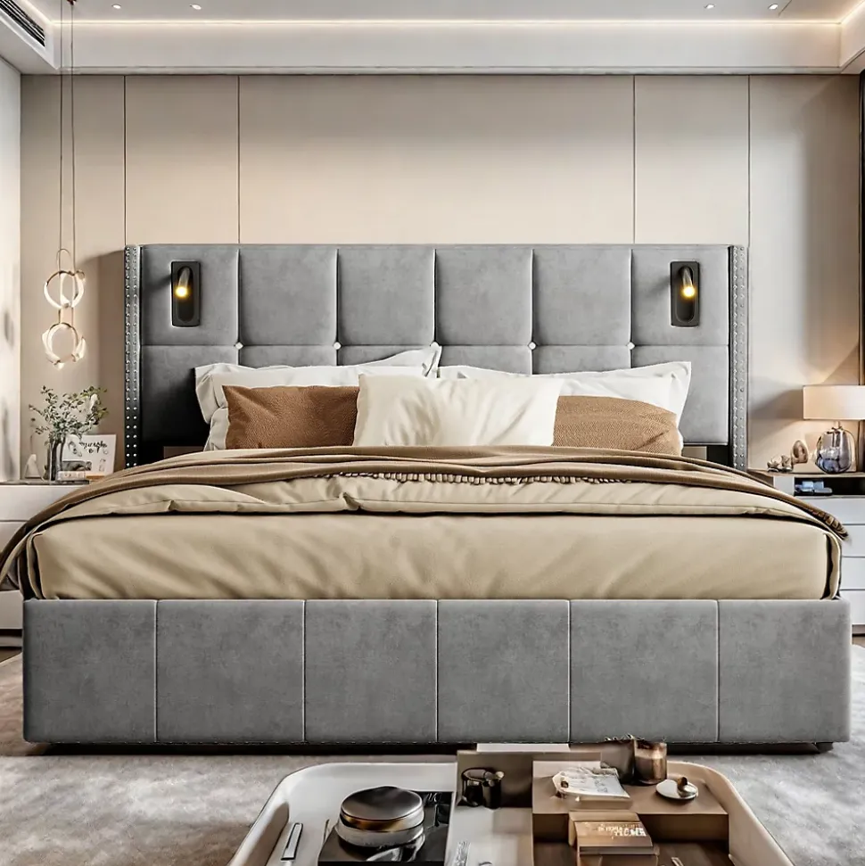 1. Accès facile : Le système de levage hydraulique permet un accès sans effort, idéal pour le rangement de la literie, des coussins, des couvertures et bien plus encore. Mécanisme de levage robuste : Le coffre de lit peut être facilement soulevé et abaissé, offrant ainsi un espace de rangement pratique et sans effort. Design élégant et moderne : Le cadre de lit rembourré, en gris et fabriqué avec des matériaux de haute qualité, s’intègre parfaitement dans des chambres modernes, créant une ambiance chaleureuse. Confort supplémentaire : La tête de lit douce, avec éclairage intégré, permet de s’installer confortablement pour lire ou se détendre, tout en apportant une touche élégante à la chambre. Rangement spacieux : L’espace de rangement généreux est parfait pour stocker des articles saisonniers ou des objets quotidiens, les gardant à portée de main et soigneusement organisés.&Détails du produit&● Dimensions hors tout : 205 x 169 x 107 cm (L x l x H)● Matériel: velours + MDF + métal● Couleur : Gris● Capacité de charge : 300 KG● Convient au matelas : 160 x 200 cm (matelas non inclus)● Épaisseur de matelas recommandée : 20-30 cm ● Nombre de lattes : 12● Nombre de colis : 2● Assemblage requis : Oui&Remarques&※ En raison de la mesure manuelle, un écart de 2 à 3 cm peut se produire.※ En raison de l’influence de la lumière du soleil et d’autres facteurs, il peut y avoir de légères différences de couleur.※ Ce produit sera expédié en 2 colis. Ils peuvent arriver à des moments différents. Veuillez patienter.※ Si vous avez des questions pendant l’installation, veuillez nous contacter dès que possible.