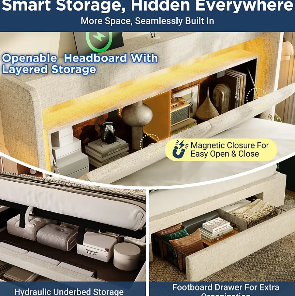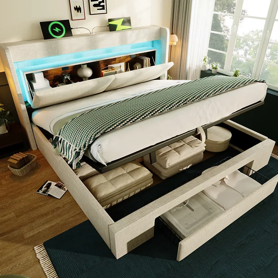 - 【Éclairage LED discret à effet flottant】 Le ruban LED dissimulé sous le couvercle du compartiment crée un effet lumineux suspendu, avec réglage des couleurs, des modes et de l’intensité pour adapter l’ambiance du couchage aux moments de repos ou de lecture.