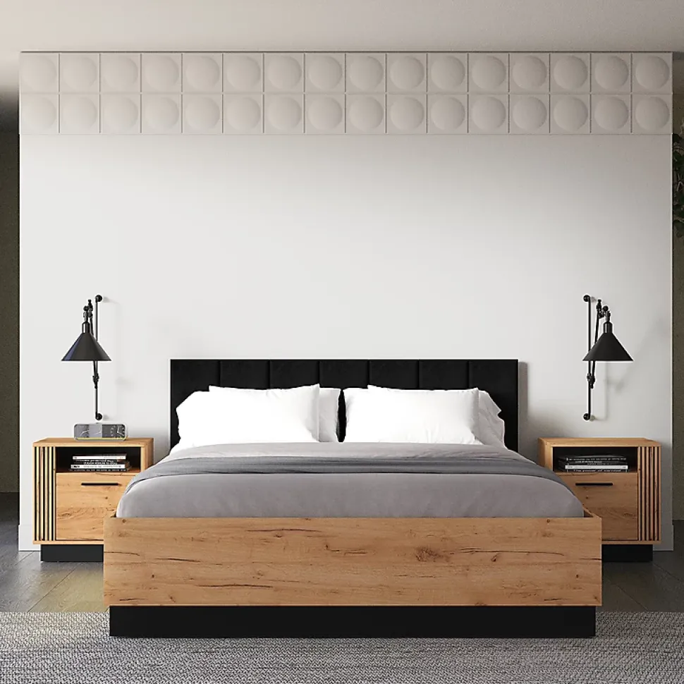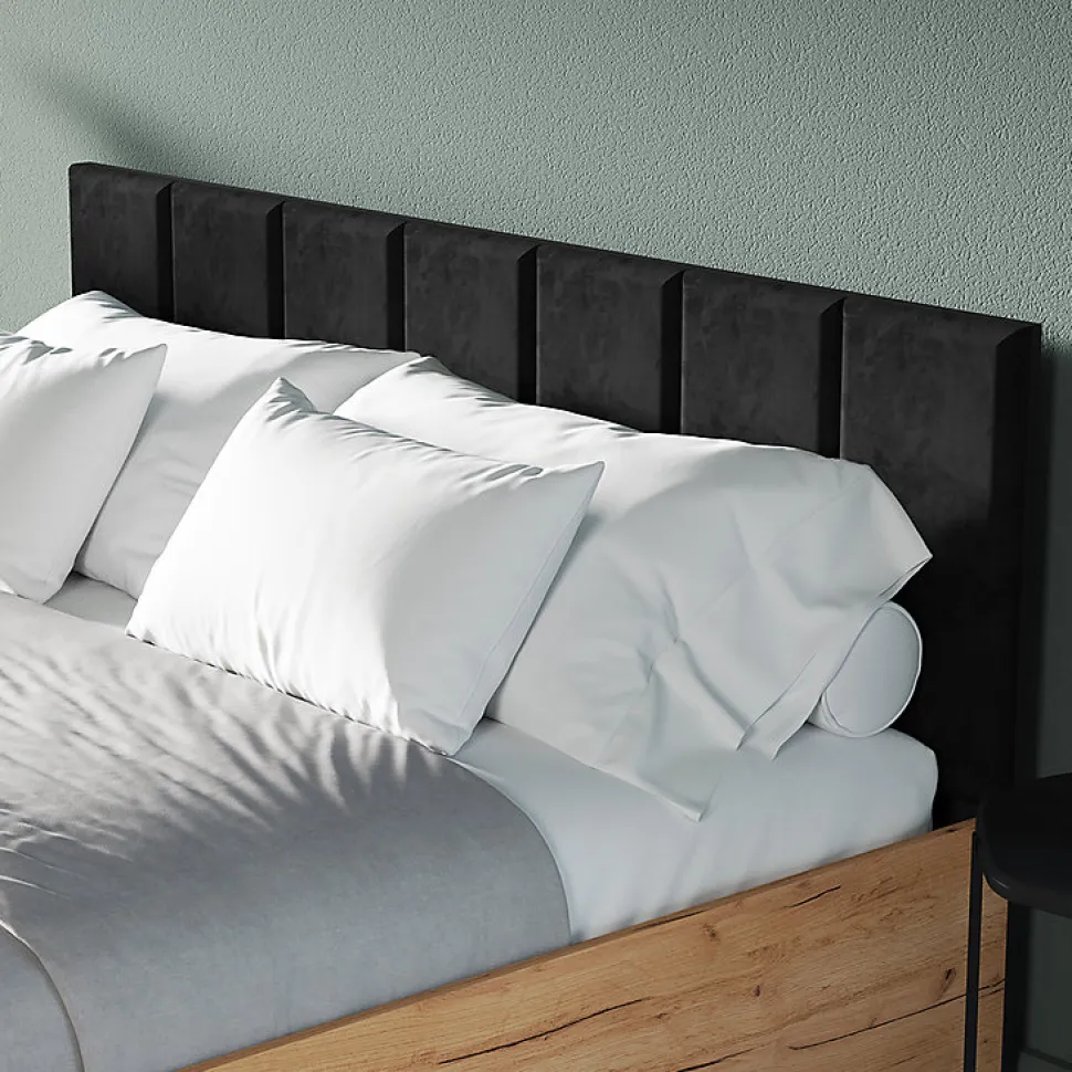- Matériaux : panneaux mélaminés – Tête de lit rembourrée en mousse polyester – Sommier en bois et cadre en métal – Bonne résistance aux rayures, à l’humidité et aux températures élevées