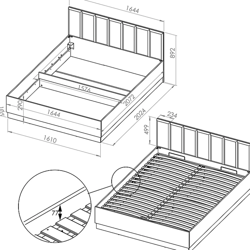 - Caractéristiques : Sommier inclus – Verin à gaz avec amortisseur – 1 grand coffre de rangement divisé en 2 compartiments – Poids maximum conseillé : 200 kg – Matelas non inclus – Ce lit existe en 140×200 cm et 160×200 cm