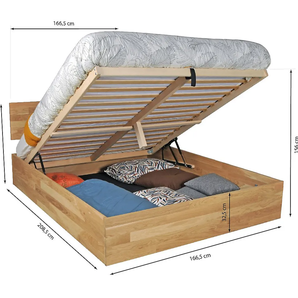 Lit coffre 160x200cm MILO avec tête de lit + sommier/ Chêne massif huiléLe lit coffre MILO 160×200 cm allie élégance et praticité. Avec sa tête de lit raffinée et son bois de chêne massif huilé, il apporte une touche chaleureuse à votre chambre. Sa grande capacité de stockage sous le matelas permet de garder votre espace organisé et dégagé. Un choix parfait pour ceux qui recherchent à la fois confort, style et fonctionnalité.Caractéristiques:- Structure en chêne massif huilé- Grande capacité de stockage avec un coffre de 687 litres- Tête de lit incluse.- Dimensions : 208.5 x 166.5 x 84.5 cm- Sommier 15 lattes multiplisLivré démonté avec sommier et sans matelas. A monter soi-même.Dimensions:208.5 x 166.5 x 84.5 cm