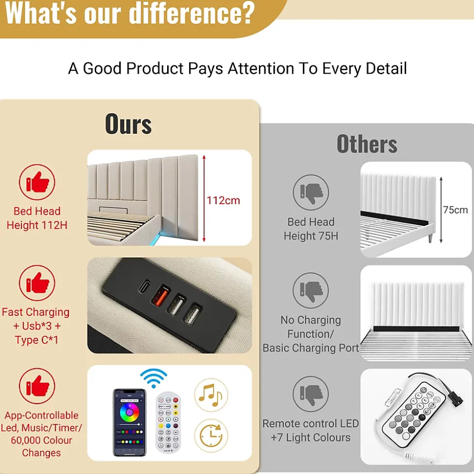 - 【Ambiance lumineuse personnalisée】 Les bandes LED intégrées autour du lit offrent une large palette de couleurs, contrôlables via une application ou une télécommande. Que vous soyez en train de lire ou de vous détendre, elles s’ajustent au rythme de la musique pour créer une atmosphère immersive et unique.