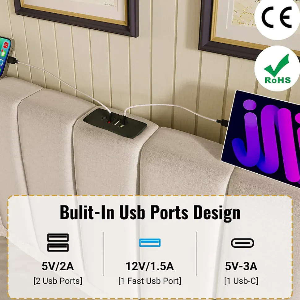 - 【Recharge rapide et pratique】 Ce lit est équipé de 3 ports USB, 1 port Type-C et d’un port de charge rapide 20W, permettant de charger simultanément plusieurs appareils électroniques tels que votre smartphone, tablette et écouteurs. Fini le désordre des câbles et les longues attentes pour recharger vos appareils.