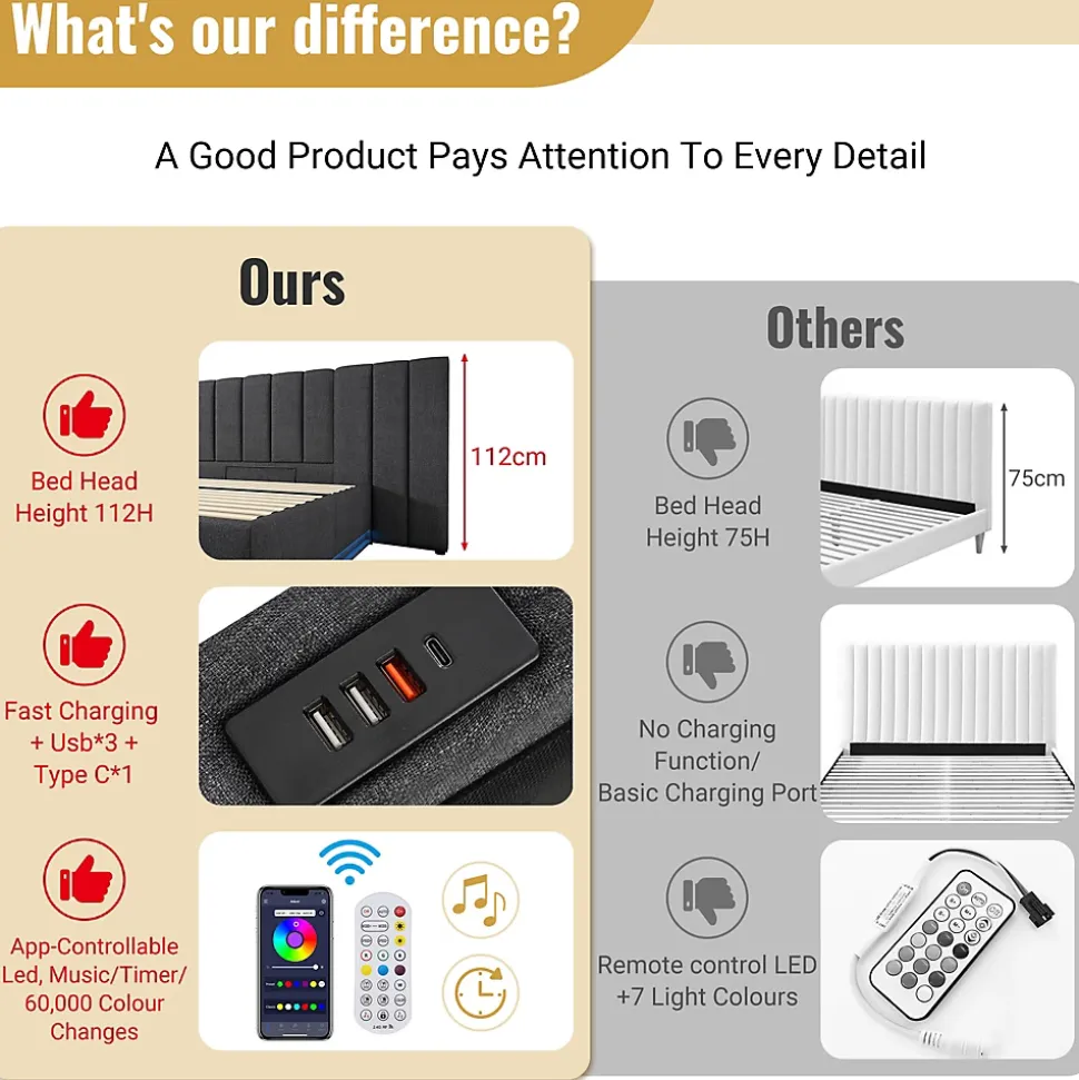 - 【Ambiance lumineuse personnalisée】 Les bandes LED intégrées autour du lit offrent une large palette de couleurs, contrôlables via une application ou une télécommande. Que vous soyez en train de lire ou de vous détendre, elles s’ajustent au rythme de la musique pour créer une atmosphère immersive et unique.