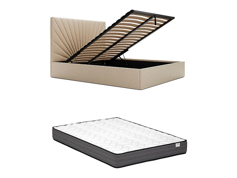 Apportez douceur et sobriété à votre chambre grâce au lit coffre RILIODA ! Avec son revêtement en tissu et sa tête de lit au style vintage, ce lit saura vous charmer. Son petit + : Le lit RILIODIA est équipé d’un sommier coffre vous permettant de créer un réel espace de rangement à l’abri des regards.1 x Cadre de lit RILIODACaractéristiques Couleur (nuance) : Beige Matière (précision) : 100 % Polyester Structure : Bois, Panneau de particules Finition : Chiné, Matelassé Taille (couchage) : 180 x 200 cm Nombre de places : 2 places Garnissage : Mousse polyuréthane Densité (garnissage) : 25 kg/m³ Gamme : Good for Planet Produit : Fabriqué en Europe Charge maximale supportée : 250 kg À monter soi-même : Ce lit est compatible avec tous les matelas 180×200 cmDimensions Longueur : 193 cm Hauteur : 120 cm Profondeur : 214 cm Hauteur de couchage : 31 cm1 x Matelas classique AMBRACIECaractéristiques Technologie (âme) : Ressorts ensachés Nombre de ressorts (matelas) : 667 Soutien : Equilibré Technologie matelas (accueil) : Mousse de confort Densité (accueil) : 23 kg/m³ Accueil : Tonique Garnissage du matelas : Fibres de polyester Coutil (matière) : Coutil stretch Couleur (nuance) : Blanc Matière (précision) : 100 % Polyester Taille (couchage) : 180 x 200 cm Nombre de places : 2 places Indépendance de couchage : Indépendance de couchage Réversible été/hiver, Carénage Gamme : Good for Planet Produit : Fabriqué en Europe Compressé/roulé : Compressé/rouléDimensions Longueur : 200 cm Hauteur : 20 cm Profondeur : 180 cm Epaisseur matelas : 20 cm Hauteur de l’âme : 15 cm1 x Cadre à lattes ALANECaractéristiques Couleur (nuance) : Blanc Matière (précision) : Métal Epaisseur métal : 2 mm Taille (couchage) : 180 x 200 cm Nombre de places : 2 places Sans pieds Technologie (sommier) : Lattes actives Nombre de lattes : 34 lattes Matière des lattes : Bois (bouleau) Sens d’ouverture : Ouverture Verticale Gamme : Good for Planet Produit :
