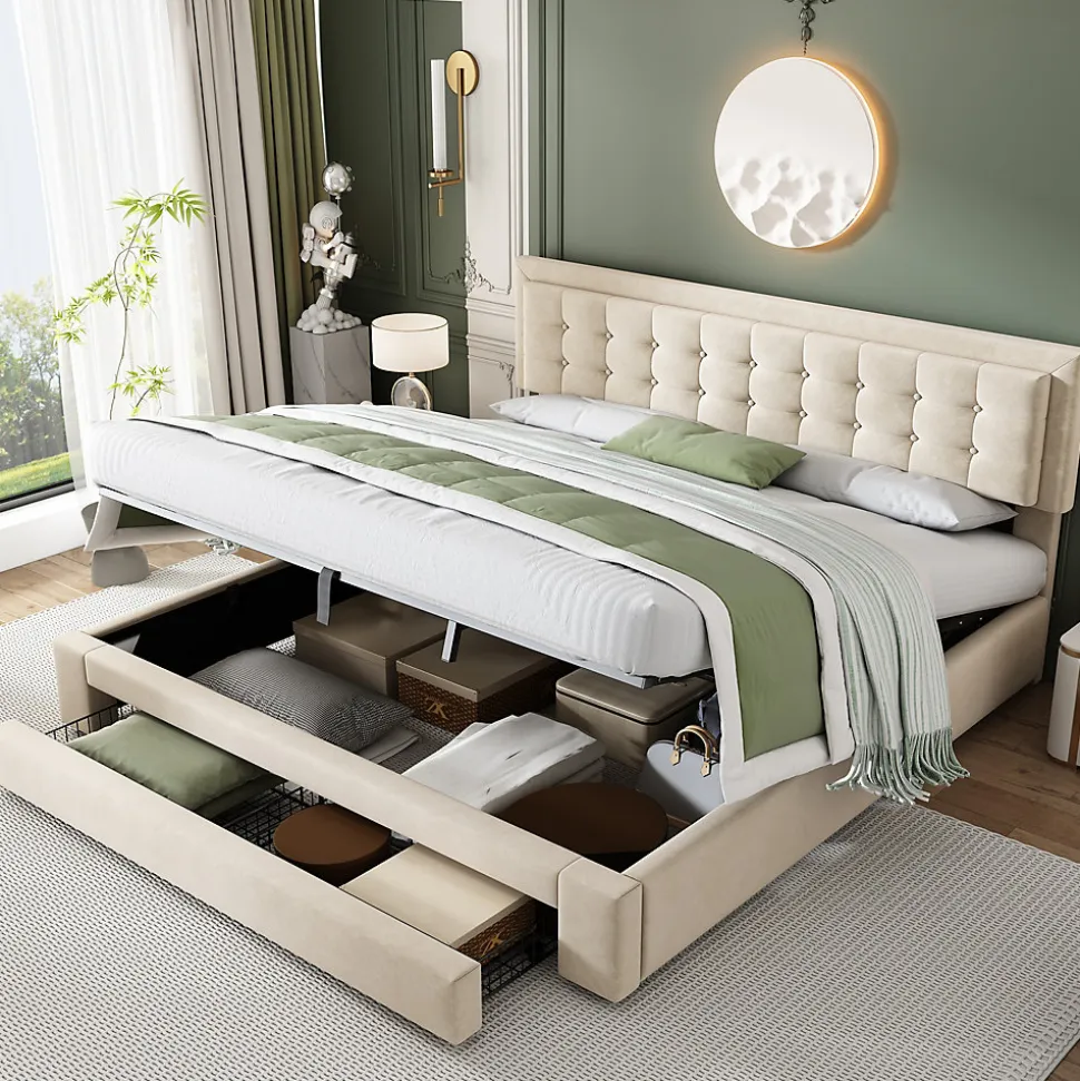 - 【Rangement Pratique et Efficace】 Ce lit est équipé d’un système de rangement puissant avec des barres hydrauliques et des tiroirs à mailles métalliques, permettant de stocker vos objets et de garder votre chambre propre et bien organisée tout en étant facile à nettoyer.
