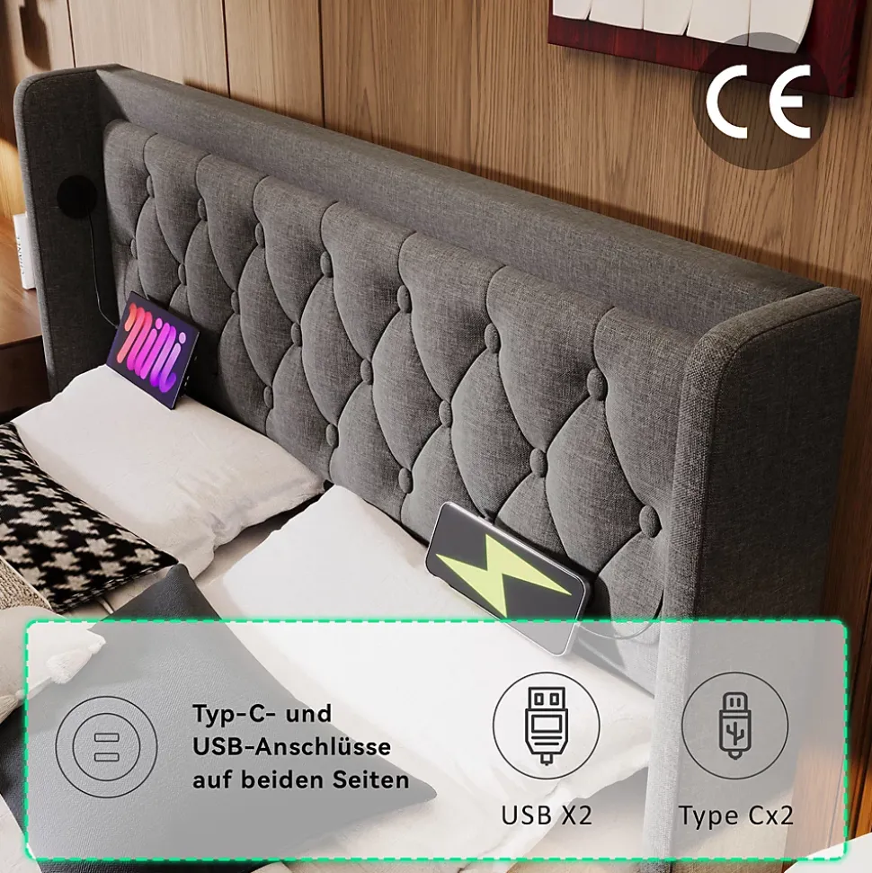 ▶ ▶ Détails ▶────────────────● Nom du produit : Lit double● Dimensions totales : 210 x 190 x 101 cm (L x l x H)● Matériau des panneaux : Coton● Couleur : Gris● Poids maximal utilisateur : 300 kg / 660 LBS● Distance du tête de lit : 28 cm● Montage requis : Oui● Contenu du paquet : Cadre de lit + fonction de chargement● Design unique : Chargeur USB Type C sur tête de lit● Matelas applicable : 180 x 200 cm (matelas non inclus)● Poids brut/net (kg) : 56.51 / 50.23● Nombre de colis : 2► Remarques ►※ Ce produit sera expédié en 2 colis. Ils peuvent arriver à des moments différents. Veuillez patienter.※ En raison de la mesure manuelle, un écart de 2 à 3 cm peut se produire.※ Toutes les images des produits sont prises avec les produits réels, mais en raison de l’influence de la lumière du soleil et d’autres facteurs, il peut y avoir de légères différences de couleur.※ Si vous avez des questions pendant l’installation, veuillez nous contacter dès que possible.