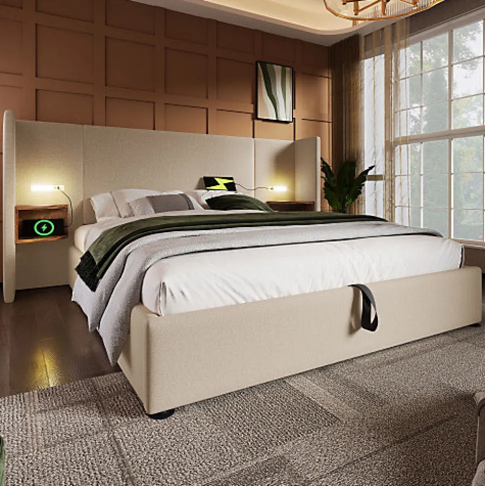 •【Conception de chevet multifonctionnelle】Le design de la tête de lit de 31 cm de large est à la fois beau et fonctionnel. Il est livré avec 2 étagères en bois pouvant contenir des livres, des chargeurs, des téléphones portables et d’autres petits objets pour garder votre table de chevet propre et organisée.•【Lampe de lecture rechargeable】La lampe de lecture sur la tête de lit a une fonction de luminosité réglable au toucher, et la lumière est douce et suffisante. Il est également équipé d’une interface USB et d’une interface Type-C, qui peuvent charger des smartphones, tablettes et autres appareils, offrant une expérience d’utilisation plus intelligente et plus pratique.•【Lit de stockage hydraulique】Le cadre de lit est équipé de vérins hydrauliques de haute qualité et présente une conception de sangle à l’extrémité du lit, ce qui facilite le levage et l’abaissement.•【Structure stable】Le cadre de lit est composé d’un cadre en métal et de lattes en bois massif. La base est équipée de pieds de support en métal pour augmenter encore la stabilité du cadre de lit. La conception encastrée du cadre de lit et les barres métalliques sur la tête de lit empêchent le matelas de glisser, garantissant ainsi une utilisation stable et confortable.
