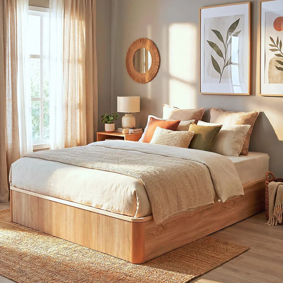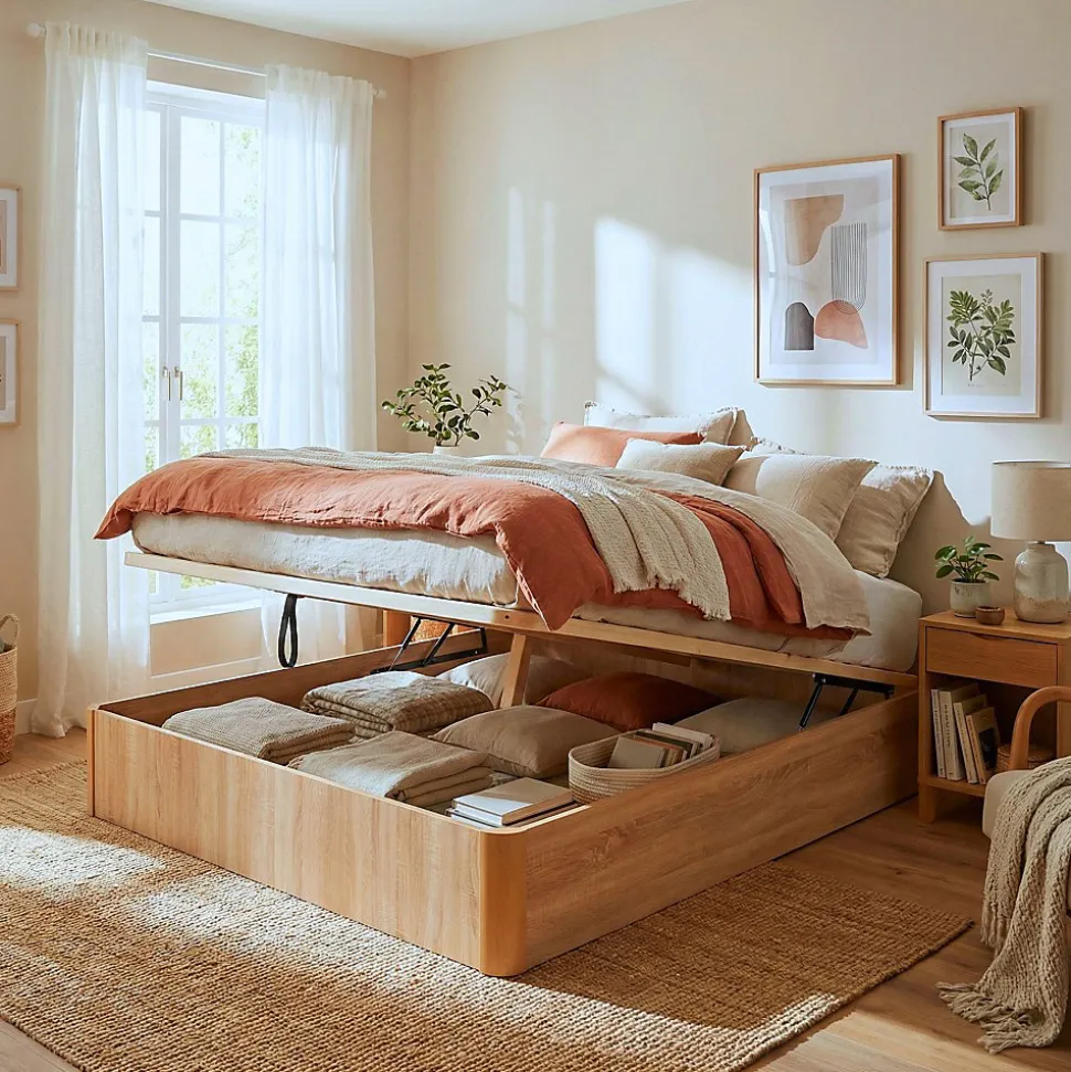 LIT COFFRE 180×200 VERSO + 1 SOMMIER / Décor Chêne BlanchiOptimisez votre espace tout en offrant une touche d’élégance à votre chambre avec le lit VERSO 180×200 cm. Les plus produit: – Un design simple mais qui apportera du charme votre chambre grâce à ses finitions en décor chêne blanchi- Facilité d’ouverture du coffre et grande capacité de rangement de 1132 litres!Caractéristiques: – Couleur: Décor chêne blanchi- Dimension couchage: 180×200 cm- Dimension coffre: 195.5 x 175.5 x 33cm- Capacité coffre: 1132 litres- Longueur hors tout: 201cm- Largeur hors tout: 180cm- Hauteur hors tout: 35cm- Matière : panneau de particules + pieds en tilleul massif laqué- Sommier, cadre et pieds central en tilleul massif.- Fond du coffre en textile- Types de lattes plates : multiplis- Poids maximum du matelas à utiliser : 30 kgLivré démonté et sans matelas, à monter soi-mêmeDimensions: