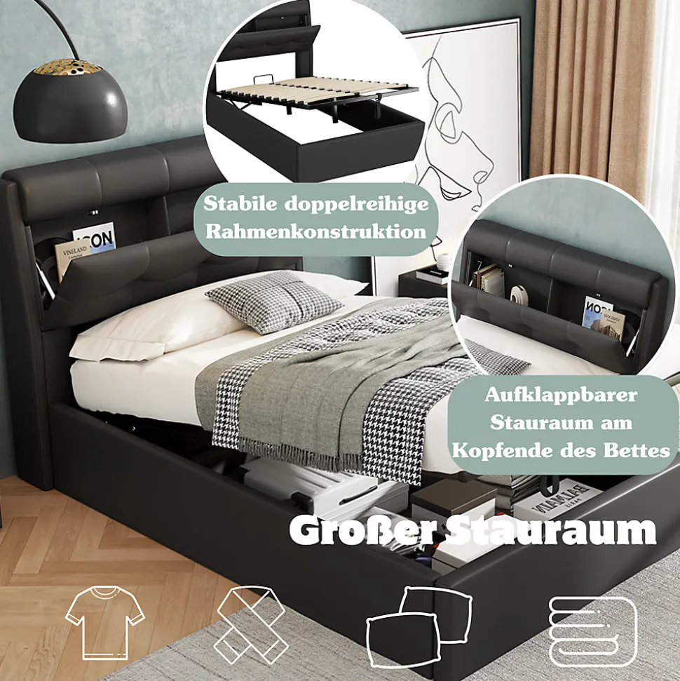 ▶ ▶ Détails ▶────────────────● Nom du produit : Polsterbett● Dimensions du produit : 216 × 98 × 106 cm● Surface de couchage : 90 × 200 cm (Sans matelas)● Couleur : Noir● Matériau principal : PU● Capacité maximale : 150 kg● Poids net : 42,85 kg● Rangement : Espaces intégrés dans la tête de lit et sous le sommier● Fonction : Cadre de lit hydraulique, ouverture facile et pratique● Sommier : Soutien équilibré, prolonge la durée de vie du matelas● Style : Design moderne, idéal pour une chambre tendance► Remarques ►※ Ce produit est livré en 2 colis qui peuvent arriver séparément. Merci de patienter.※ Une marge d’erreur de 2 à 3 cm peut apparaître en raison des mesures manuelles.※ Les photos sont prises à partir de produits réels, mais la lumière ou d’autres facteurs peuvent entraîner des différences de couleur.※ En cas de question lors du montage, veuillez nous contacter rapidement.
