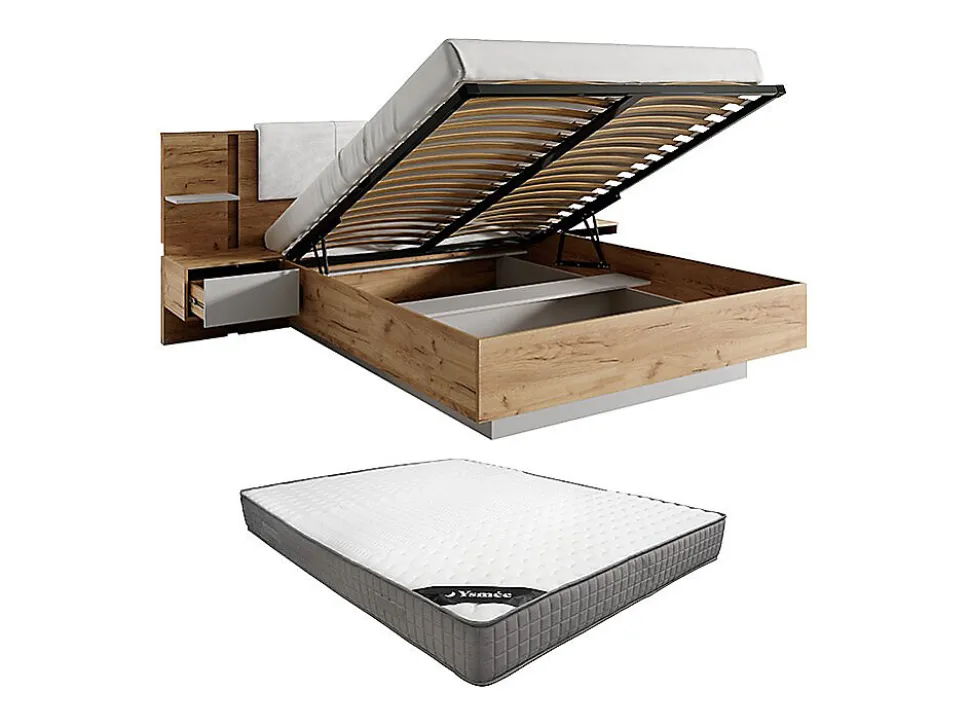 La lit avec chevets ELYNIA sera le choix parfait pour une ambiance chic et moderne dans votre chambre. Il vous offrira des espaces de rangement pratiques notamment avec ses 2 chevets intégrés, tandis que ses lumières LEDs ajouteront une ambiance chaleureuse et relaxante à votre pièce.1 x Cadre de lit ELYNIACaractéristiques Couleur (nuance) : Blanc, Naturel clair Matière (précision) : Panneau de particule Finition : Mélaminé Taille (couchage) : 160 x 200 cm Nombre de places : 2 places Avec leds Couleur des LEDs : Blanc Type de commande : Interrupteur Type de branchement : Prise secteur Avec chevet Type de rangement : 2 tiroirs, Etagère Nombre d’étagères : 2 Tiroir coulissant push to open Produit : Fabriqué en Europe Charge maximale supportée : 240 kg À monter soi-même : Ce lit est compatible avec tous les sommiers et matelas 160×200 cm : Possibilité d’intégrer un sommier coffre pour créer un espace de rangement supplémentaire dans le lit Charge maximale d’un tiroir : 2 kgDimensions Longueur : 256.4 cm Hauteur : 104.4 cm Profondeur : 210 cm Hauteur de couchage : 42 cm Chevet : L37,6 x H12 x P28,4 cm1 x Matelas classique DANEVOCaractéristiques Technologie (âme) : Mousse Soutien : Equilibré Densité (âme) : 25 kg/m³ Technologie matelas (accueil) : Mousse à mémoire de forme Densité (accueil) : 40 kg/m³ Accueil : Enveloppant Garnissage du matelas : Fibres de polyester Densité (garnissage) : 100 g/m2 Coutil (matière) : Coutil stretch Couleur (nuance) : Blanc, Vert Matière (précision) : 100 % Polyester Taille (couchage) : 160 x 200 cm Nombre de places : 2 places Réversible été/hiver, 4 poignées de transport Traitement : Anti-bactériens Gamme : Espace pro Compressé/roulé : Compressé/rouléDimensions Longueur : 200 cm Hauteur : 22 cm Profondeur : 160 cm Epaisseur matelas : 22 cm Hauteur de l’âme : 18 cm Epaisseur mémoire de forme : 2 cm1 x Cadre à lattes ALANECaractéristiques Couleur (nuance) : Blanc