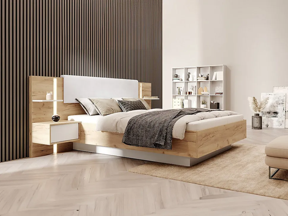 - Lit coffre 160 x 200 cm avec chevets – Avec sommier et matelas – LEDS – Structure : Panneaux de particules – Coloris : Naturel et blanc – Dimensions : L256,4 x H104,4 x P210 cm – Style : Moderne – Découvrez l’élégance du lit ELYNIA !
