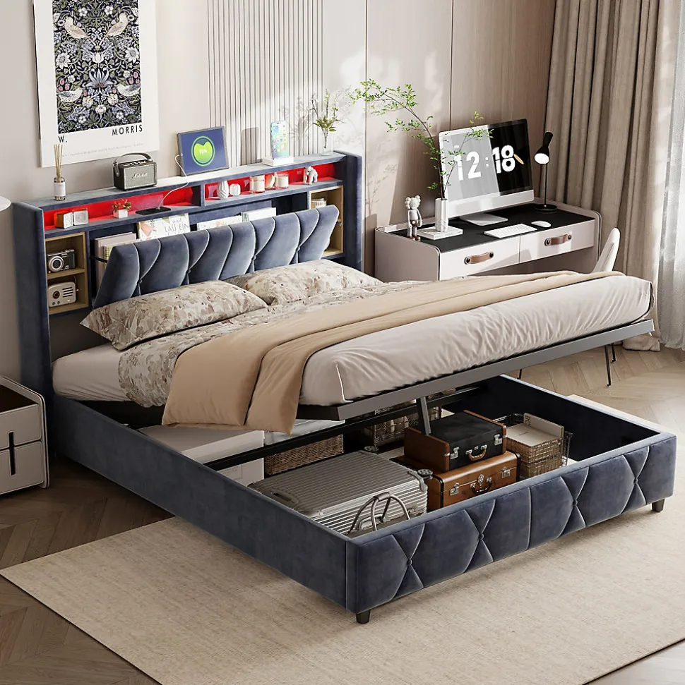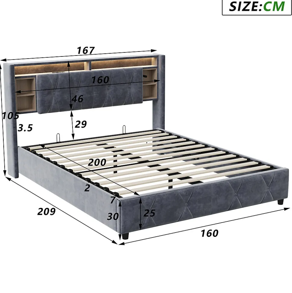 Lit double avec LED et rangement 140×200 cm – Velours GrisCe lit rembourré en velours doux et élégant ajoute une touche de luxe à votre chambre. La tête de lit avec LED intégrée vous permet de créer l’ambiance parfaite pour la lecture ou le repos, avec un contrôle facile de la couleur et de l’intensité via télécommande.Le lit offre un espace de rangement flexible sous le sommier à lattes, parfait pour stocker des articles comme des vêtements ou des couvertures. Sa structure robuste en bois massif et métal assure un excellent soutien et une longue durabilité.Montage requis.Matelas non inclus.Livré en 2 colis.Dimensions totales : 145 × 212 × 107 cmMatelas compatible : 140 × 200 cmPoids du produit : 44 kg