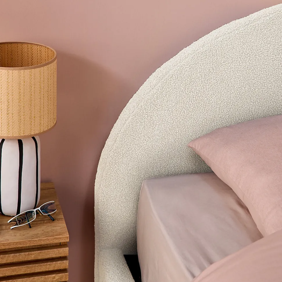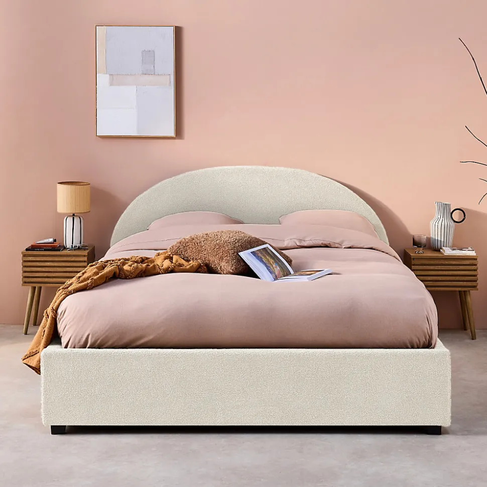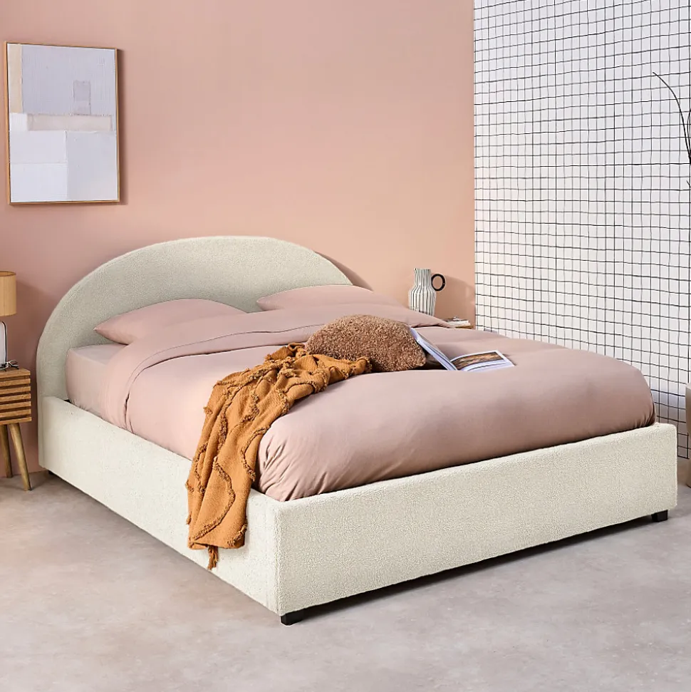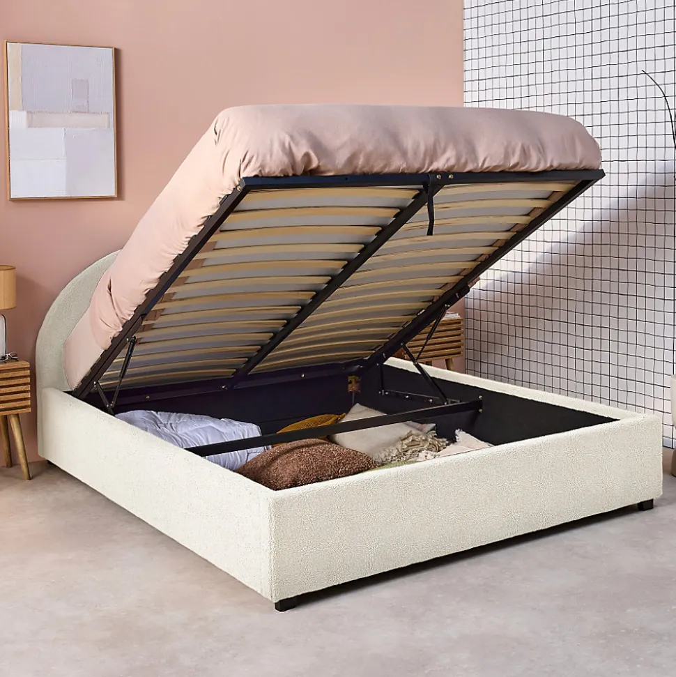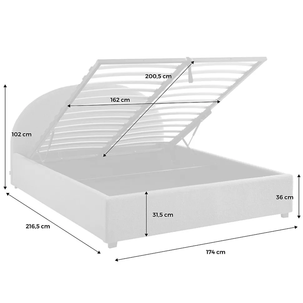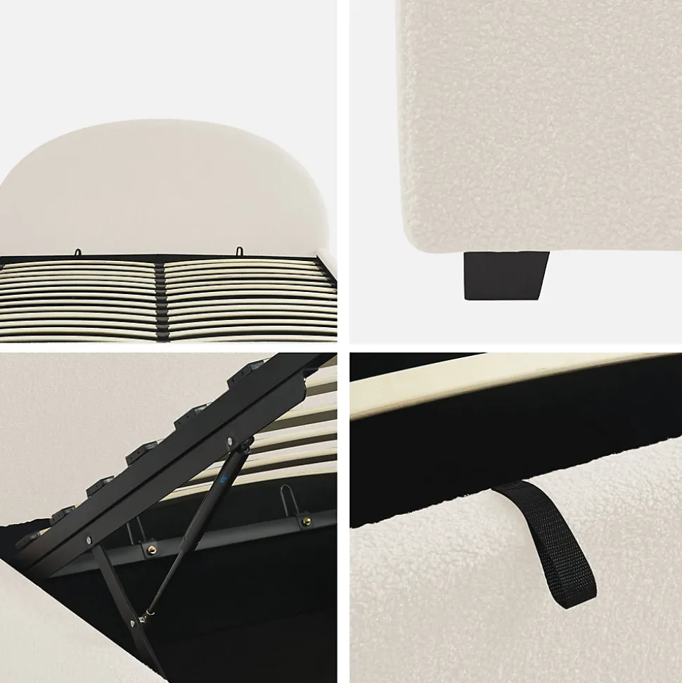 Les + produit :Coffre de rangementRobuste et durableTête de lit confortableSommier à lattes en bois compositeFinition boucletteLes matériaux choisis pour la conception de notre lit Cameron assurent robustesse et longévité.Le bois d’eucalyptus, connu pour sa résistance, est combiné à des panneaux composites qui apportent une stabilité supplémentaire.Le revêtement en polyester est non seulement durable, mais aussi résistant à l’usure. La tête de lit arrondie procure un soutien additionnel qui améliore le confort global du lit, la rendant particulièrement agréable avec sa finition bouclette.Equipé d’une poignée pour lever le sommier, le coffre de rangement est un atout incontestable pour ranger tout ce dont on a besoin.Le lit Cameron s’adapte facilement à différents styles de décoration intérieure, apportant immédiatement une ambiance chaleureuse.Le sommier à lattes en bois composite assure une ventilation optimale du matelas tout en offrant un soutien uniforme. Cela permet de prolonger la durée de vie de votre matelas et à améliorer la qualité de votre sommeil, (et ça, c’est non négligeable !)Informations complémentaires :Existe aussi en d’autres tailles : Simple (90x190cm) / Double (140x190cm)Décliné en 3 couleurs : Kaki – Nude – Blanc.Matelas non fourni.Produit à monter, notice fournie.Toutes les couleurs représentées à l’écran peuvent être altérées par plusieurs facteurs, mais aussi parfois par la configuration de votre écran, par la lumière et parfois même par l’angle de vision. Pour en savoir plus nous vous invitons alors à vous diriger vers notre service client qui se fera un plaisir de vous renseigner. Attention, les retours produits dû à ces motifs seront à la charge du client.Caractéristiques et dimensions :Nombre de place : 2Dimensions : L 216,5 x P 174 x H 102cmHauteur d’assise : 36cmDimensions sommier : 200,5 x 162cmDimensions tête de lit : L 174 x P 8 x H 102cmDimensions coffre (intérieur) : 202 x 162 x 20cmNombre de la