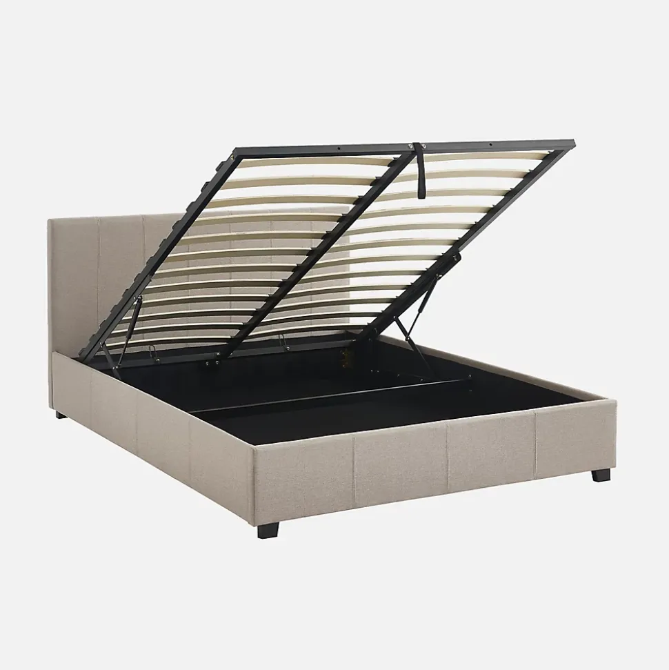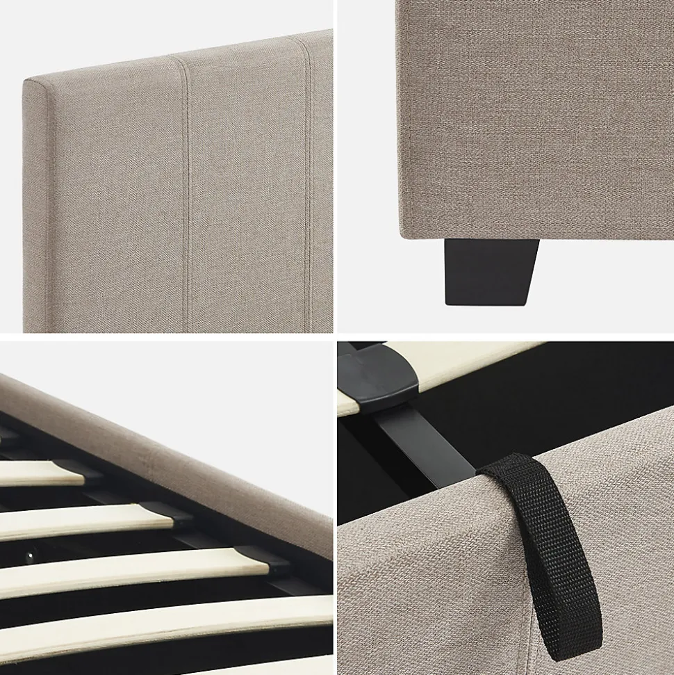 Les + produit :Coffre de rangementRobuste et durableTête de lit confortableSommier à lattes en bois compositeLes matériaux choisis pour la conception de notre lit Avalon assurent robustesse et longévité.Le bois d’eucalyptus, connu pour sa résistance, est combiné à des panneaux composites qui apportent une stabilité supplémentaire.Le revêtement en polyester est non seulement durable, mais aussi résistant à l’usure. La tête de lit procure un soutien additionnel qui améliore le confort global du lit, la rendant particulièrement agréable.Equipé d’une poignée pour lever le sommier, le coffre de rangement est un atout incontestable pour ranger tout ce dont on a besoin.Le lit Avalon s’adapte facilement à différents styles de décoration intérieure, apportant immédiatement une ambiance chaleureuse.Le sommier à lattes en bois composite assure une ventilation optimale du matelas tout en offrant un soutien uniforme. Cela permet de prolonger la durée de vie de votre matelas et à améliorer la qualité de votre sommeil, (et ça, c’est non négligeable !)Informations complémentaires :Existe aussi en d’autres tailles : Simple (90x190cm) / Queen size (160x200cm)Décliné en deux couleurs : beige et gris clair.Existe aussi en finition velours côtelé (grosse côte)Matelas non fourni.Produit à monter, notice fournie.Toutes les couleurs représentées à l’écran peuvent être altérées par plusieurs facteurs, mais aussi parfois par la configuration de votre écran, par la lumière et parfois même par l’angle de vision. Pour en savoir plus nous vous invitons alors à vous diriger vers notre service client qui se fera un plaisir de vous renseigner. Attention, les retours produits dû à ces motifs seront à la charge du client.Caractéristiques et dimensions :Dimensions : L 202 x P 148 x H 86cmHauteur d’assise : 29,5cmDimensions sommier : 190,5 x 139cmDimensions tête de lit : L 148 x P 5 x H 86cmDimensions coffre (intérieur) : 193 x 142 x 20cmNombre de lattes : 24 Dimensi