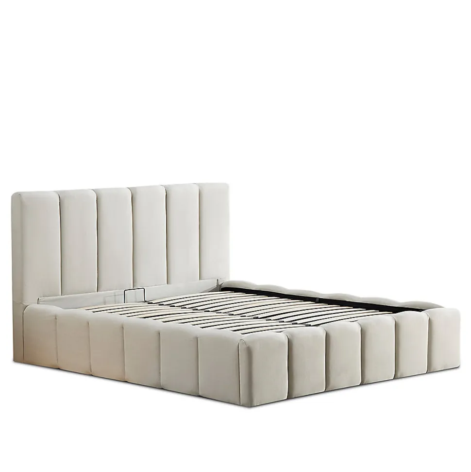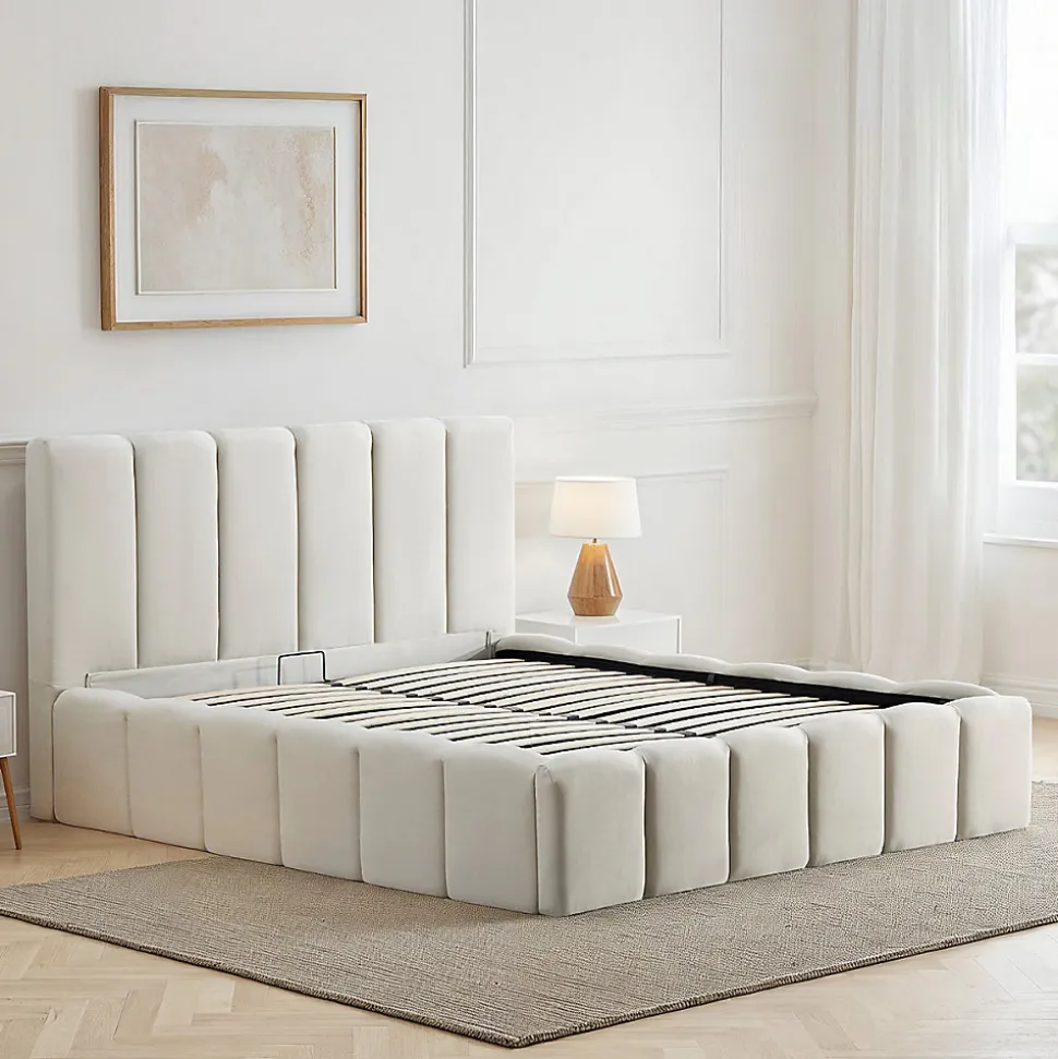 POINTS FORTS :Élégance contemporaine : La tête de lit au motif nervuré et son habillage beige apportent une allure raffinée et lumineuse, idéale pour sublimer une décoration moderne ou plus classique.Soutien agréable au quotidien : Le rembourrage généreux de la tête de lit crée un dossier confortable pour profiter de vos moments de lecture ou de détente.Solidité à toute épreuve : Grâce aux vérins hydrauliques, l’ouverture du coffre de rangement intégré se fait en douceur, offrant un vaste espace pour organiser linge de lit et accessoires.Structure robuste et durable : Fabriqué avec des matériaux fiables, le lit Madeleine est conçu pour offrir stabilité et durabilité au fil des années.Tissu pratique et résistant : Le tissu d’ameublement beige, réputé pour son charme naturel, se nettoie facilement et garde un bel aspect même en cas d’usage intensif.CARACTERISTIQUES :Dimensions disponibles :- 140×190 cm (150 x 207 x 112 hors tout)- 160×200 cm (170 x 217 x 112 hors tout)- 180x200cm (190 x 217 x 112 hors tout)Tête de lit :- Hauteur : 112 cm- Epaisseur : 12 cmCadre :- Pan en bout de lit : Hauteur 30 cm – Epaisseur 3 cm- Pans latéraux du lit : Hauteur 30 cm – Epaisseur 4 cm- Hauteur avec pieds (inclus) : 32 cm- Sommier : 2×16 lattes (140×190 et 160×200) / 2×24 lattes (180×200)- Coffre de rangement avec vérins hydrauliquesConditionnement : Livré en kit avec notice de montage (2 colis)Garantie : 2 ansCOMPOSITION :Structure :- Bois MDF multiplis recouvert d’un tissu d’ameublement beige- Fond du coffre en tissu non tisséTête de lit :- Bois MDF multiplis recouvert d’un tissu d’ameublement beige- Garnissage ouate polyesterSommier :- Lattes en bois de peuplier- Cadre en métal monté sur vérins