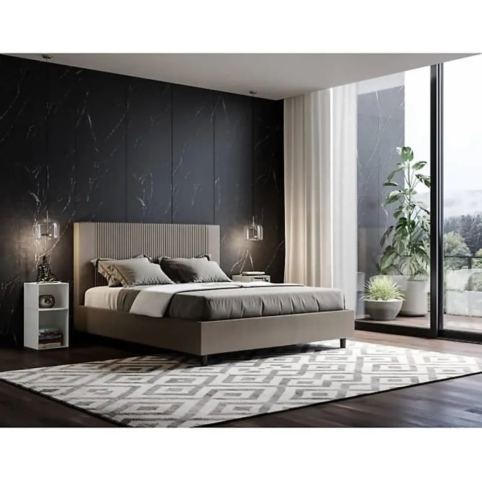Lit double Goya 160×200 avec tête de lit et lit rembourrés, revêtement en simili cuir, particulièrement polyvalent et facilement combinable avec n’importe quel style d’ameublement.Le lit double Goya 160×200 se caractérise par un style moderne et élégant, mis en valeur par la tête de lit matelassée recouverte de simili cuir.La présence du matériau en simili cuir, en plus de donner à la pièce une atmosphère accueillante et invitante, offre la commodité d’un nettoyage rapide et facile, grâce à l’utilisation d’un simple chiffon en microfibre.Lit fourni avec sommier à rangement, prévu pour un matelas 160×200 cm – Matelas non inclusCouvre-lit non amovible.Produit ItyhomeFabriqué en ItalieDimensions lit : L.175 P.220 H.122 cmHauteur des pieds : 12 cmHauteur du lit : 27 cmHauteur du filet depuis le sol : 39 cmDimensions intérieures du conteneur : L.163 P.204 H.21 cm