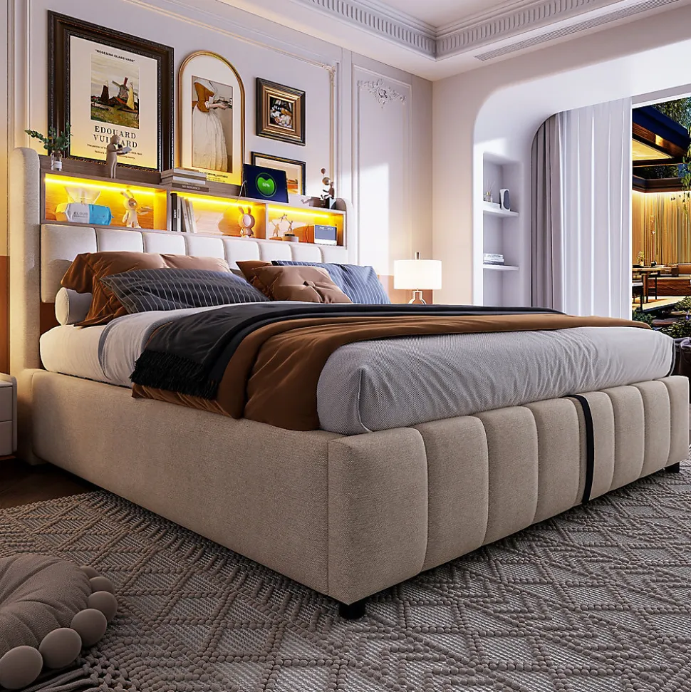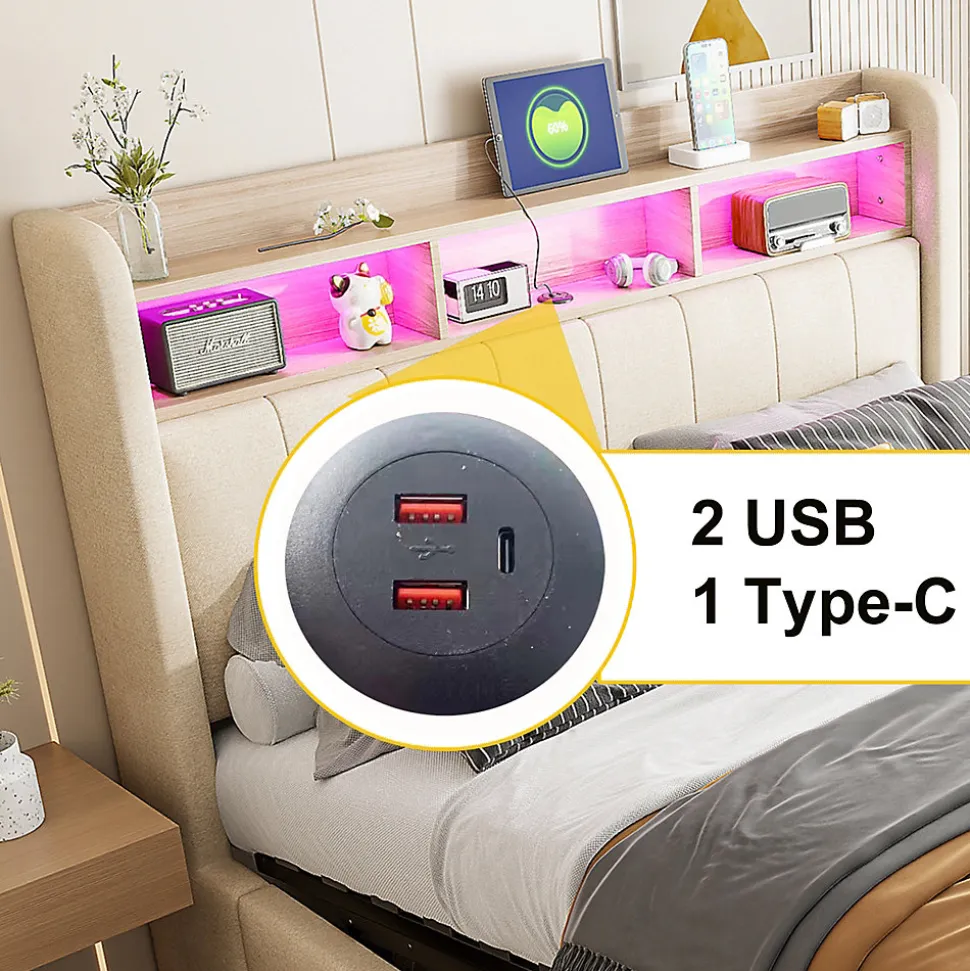 - 【Rangements supplémentaires avec options de chargement】 Des espaces de rangement pratiques sont présents au niveau du tête de lit, incluant des ports USB et Type-C intégrés pour charger vos appareils directement depuis votre lit. Pratique pour garder vos appareils à portée de main et bien chargés.