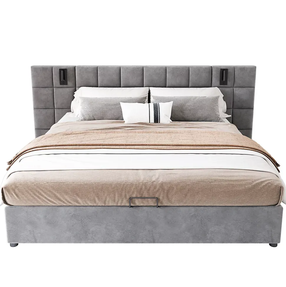 Lit coffre double capitonné rembourré velours gris, tête de lit damier avec prise USB (140 x 200 cm) Style unique : le lit rembourré impressionne par son style unique. Il comporte une tête de lit spacieuse décorée d’un grand motif à carreaux pour un look attrayant et esthétique. Il s’adapte à tous les décors et styles et attirera tous les regards dans votre chambre.Espace de rangement généreux : coffre de lit sur toute la taille du cadre de lit ; beaucoup d’espace pour le linge de lit, les couvertures et les oreillers ; économisez de l’espace dans votre garde-robe; particulièrement idéal pour les petites chambres.Caractéristiques fonctionnelles : la tête de lit du lit rembourré est équipée d’une lampe de lecture réglable et d’un port de chargement USB. Ces fonctionnalités vous permettent de lire confortablement au lit et constituent également un moyen pratique de recharger vos appareils électroniques. Cela signifie que le lit répond aux exigences d’un style de vie moderne. Caractéristiques :Matériel : Panneaux composites, acierPoids de charge : 300 kgDimensions du produit :228*102.5*200cmMatelas applicable: 140*200cmDimensions du colis 2 colis :198.12 * 26.04 * 20.96 cm128.27 * 62.23 * 20.96 cmGarantie :2 ans (voir politique de garantie) Remarque :-Le produit sera envoyé depuis dépôt en Allemagne, la livraison prendra environ 7-10 jours ouvrés pour recevoir. -Veuillez mesurer votre espace et la taille avant d’acheter. Merci pour votre compréhension!-Le produit sera envoyé depuis l’Allemagne en 2 colis, parfois les colis arrivent à des dates différentes, veuillez-vous assurer d’avoir reçu 2 colis avant de l’assembler !-Le matelas, le sommier et la literie (couette, draps, oreillers, etc.) ne sont pas inclus.