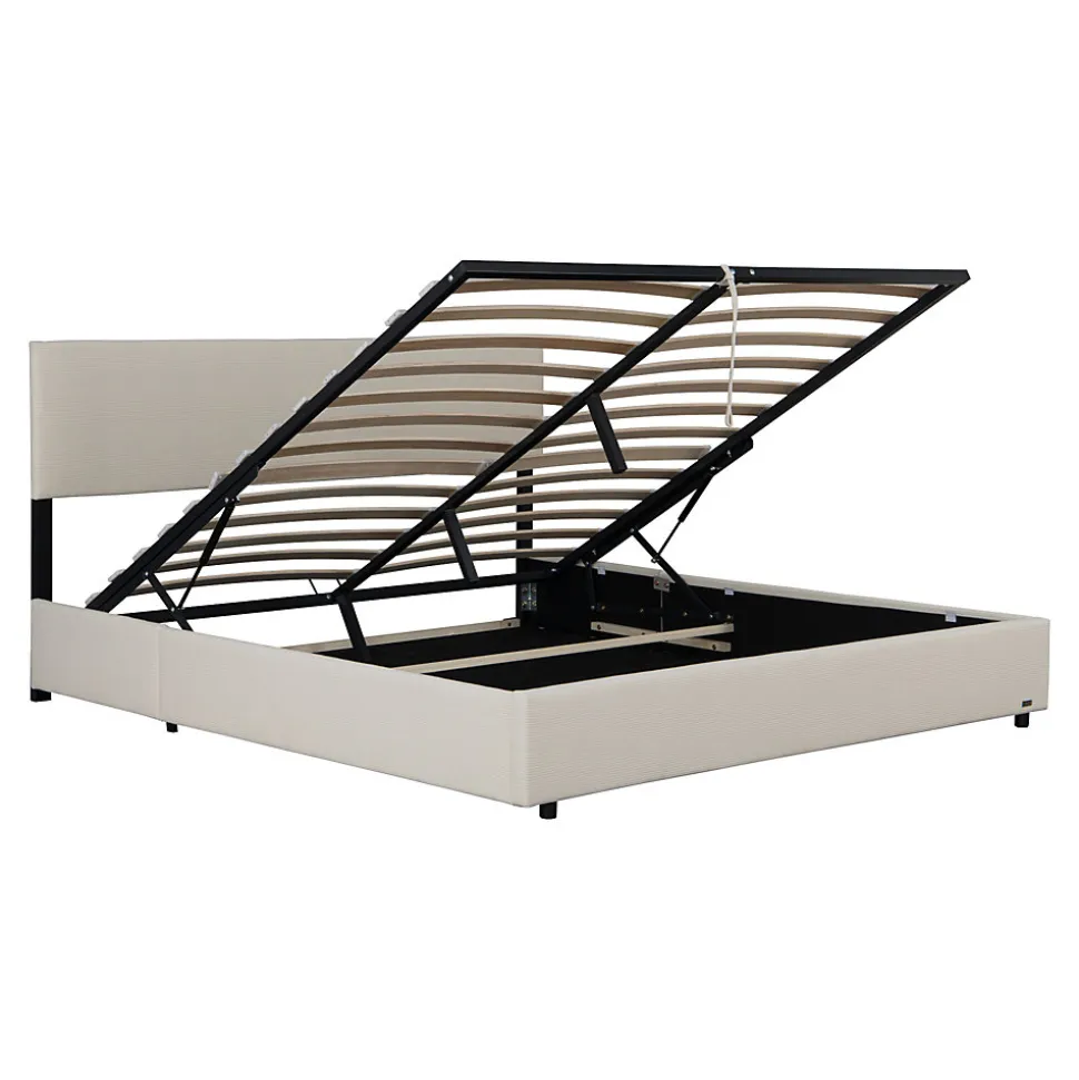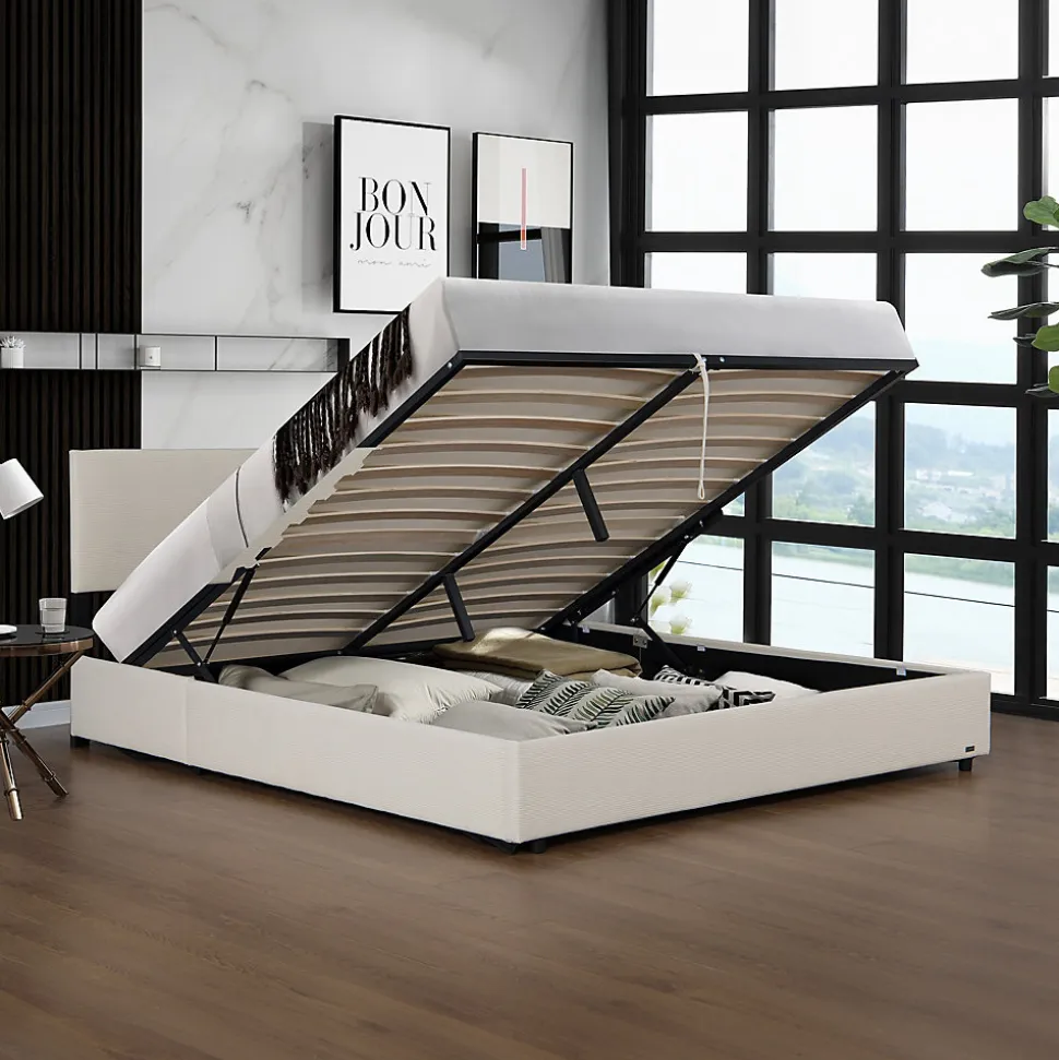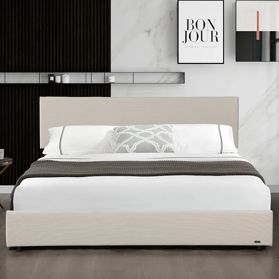Lit coffre Ce cadre de lit moderne s’intègre parfaitement dans différents styles d’aménagement. Son montage est simple et facile gâce à un design bien pensé et à des instructions clairement structurées.Le coffre de lit spacieux situé sous le sommier à lattes porteur et rabattable sert d’espace de rangement pratique pour le linge de lit, les oreillers et autres objets. Cette construction confère au matelas une base stable et favorise un sommeil profond.Points forts du produit :- lit simple et élégant- convient à différents styles d’aménagement- le sommier à lattes constitue un support stable pour le matelas- le coffre de lit généreux crée un espace de rangement- tête de lit rembourrée pour un confort supplémentaire- stabilité assurée gâce à 6 pieds robustes- montage rapide- capacité de charge jusqu’à 300 kgDimensions :- totales (lo x la x h) : 212,5 x 148 x 96,5 cm- matelas (lo x la) : 200 x 140 cm- hauteur des bords du lit : 29 cmMatière :- structure : bois + métal- housse : velours côtelé (100% polyester)Couleur :beigeContenu de la livraison :1 x cadre de lit avec sommier à lattes rabattableRemarque :Pour des raisons logistiques, le retrait par le client n’est pas disponible. La livraison est effectuée jusqu’au trottoir ou à la porte d’entrée, sans montage.Important :Attention ! La commande est indiquée hors matelas, couverture, coussins et produits de décoration.Produit de la marque Corium®.
