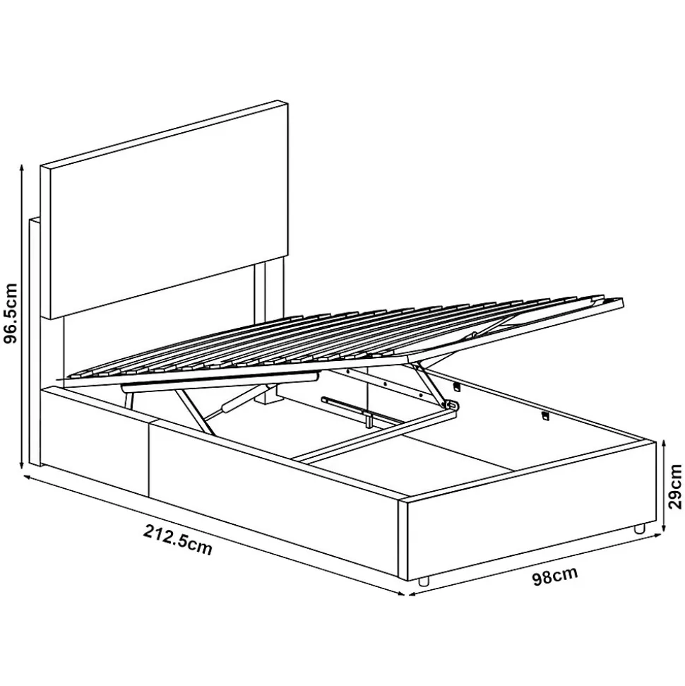 Lit coffre Ce cadre de lit moderne s’intègre parfaitement dans différents styles d’aménagement. Son montage est simple et facile gâce à un design bien pensé et à des instructions clairement structurées.Le coffre de lit spacieux situé sous le sommier à lattes porteur et rabattable sert d’espace de rangement pratique pour le linge de lit, les oreillers et autres objets. Cette construction confère au matelas une base stable et favorise un sommeil profond.Points forts du produit :- lit élégant- convient à différents styles d’aménagement- le sommier à lattes constitue un support stable pour le matelas- le coffre de lit crée un espace de rangement- tête de lit rembourrée pour un confort supplémentaire- stabilité assurée gâce à 6 pieds robustes- montage rapide- capacité de charge jusqu’à 300 kgDimensions :- totales (lo x la x h) : 212,5 x 98 x 96,5 cm- matelas (lo x la) : 200 x 90 cm- hauteur des bords du lit : 29 cmMatière :- structure : bois + métal- housse : velours côtelé (100% polyester)Couleur :beigeContenu de la livraison :1 x cadre de lit avec sommier à lattes rabattableRemarque :Pour des raisons logistiques, le retrait par le client n’est pas disponible. La livraison est effectuée jusqu’au trottoir ou à la porte d’entrée, sans montage.Important :Attention ! La commande est indiquée hors matelas, couverture, coussins et produits de décoration.Produit de la marque Corium®.