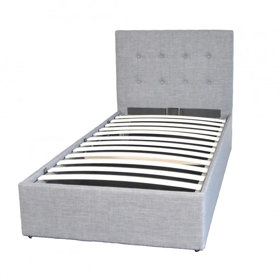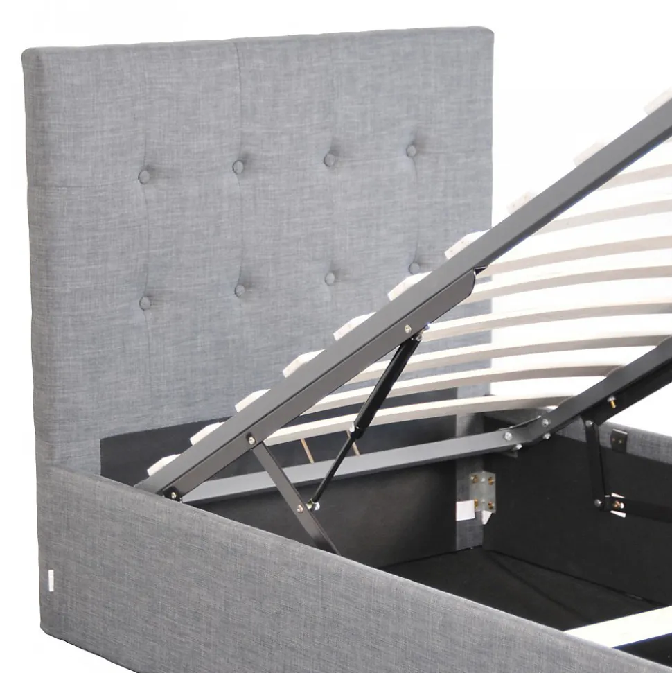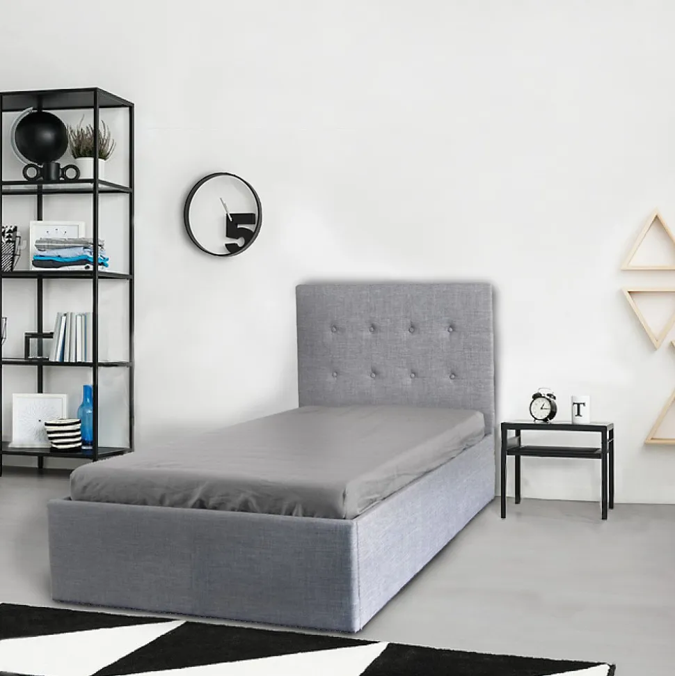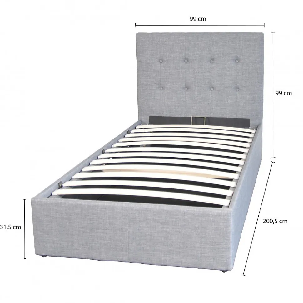 Lit coffre PARMA 90×190 cm / Gris clairLe lit coffre PARMA est idéal pour les petits espaces. Son design sobre et élégant lui permet de s’adapter à tous les intérieurs. Son avantage: un grand coffre de rangement simple d’utilisation caché sous son sommier!Les PLUS produit:- Grand coffre de rangement de 417 litres- Elégante tête de lit capitonnée incluse- Sommier inclusCaractéristiques:- Coloris : Gris clair.- Sommier 12 lattes en bois.- Cadre : MDF + Mousse + Tissu.- Tête de lit capitonnée.- Fond du coffre en tissu.Livré démonté en kit, sans matelas. A monter soi-mêmeDimensions:201x99x99 cm