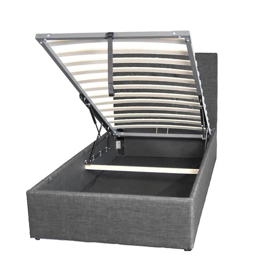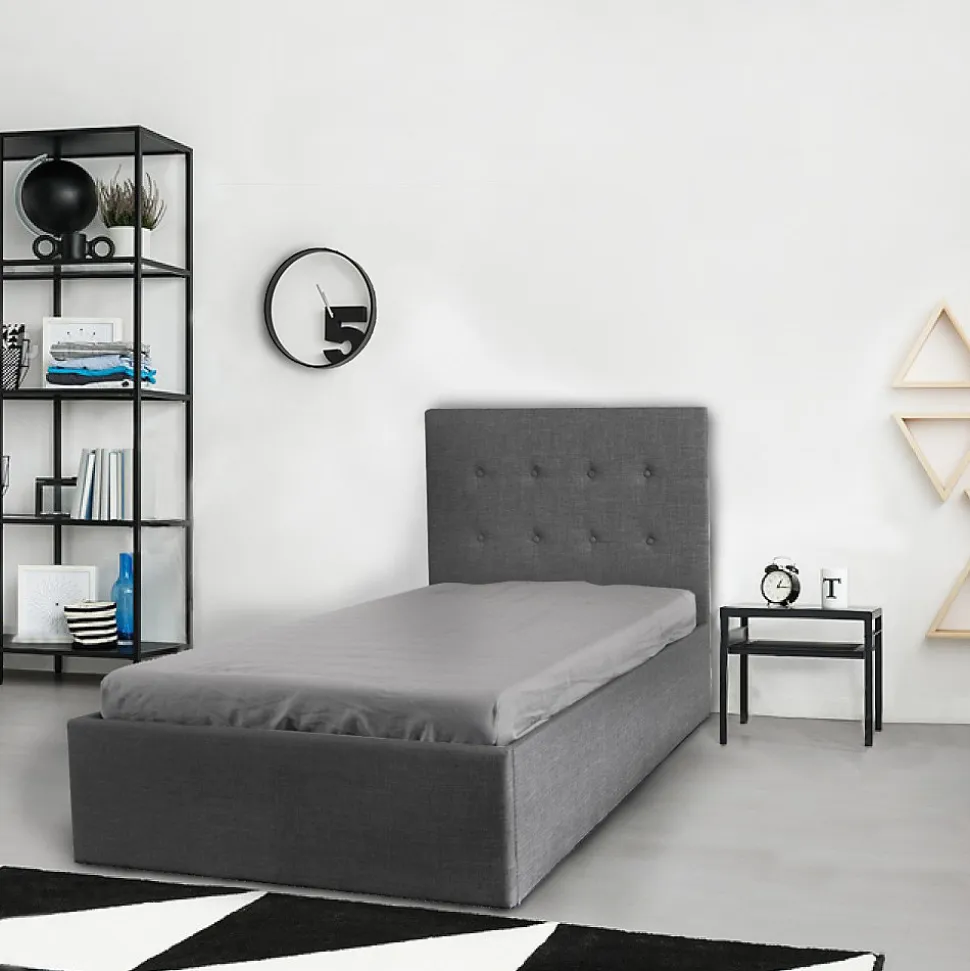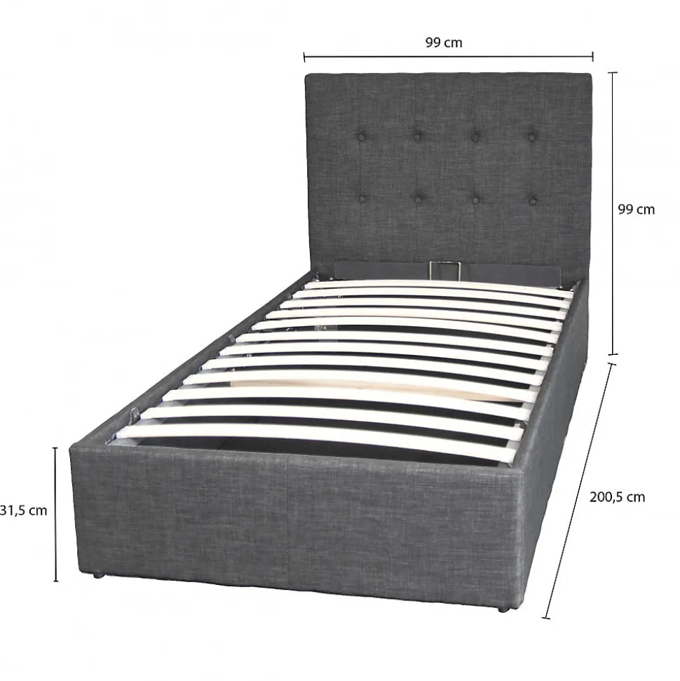Lit coffre PARMA 90×190 cm / Gris foncéLe lit coffre PARMA est idéal pour les petits espaces. Son design sobre et élégant lui permet de s’adapter à tous les intérieurs. Son avantage: un grand coffre de rangement simple d’utilisation caché sous son sommier!Les PLUS produit:- Grand coffre de rangement de 417 litres- Elégante tête de lit capitonnée incluse- Sommier inclusCaractéristiques:- Coloris : Gris foncé.- Sommier 12 lattes en bois.- Cadre : MDF + Mousse + Tissu.- Tête de lit capitonnée.- Fond du coffre en tissu.Livré démonté en kit, sans matelas. A monter soi-mêmeDimensions:201x99x99 cm