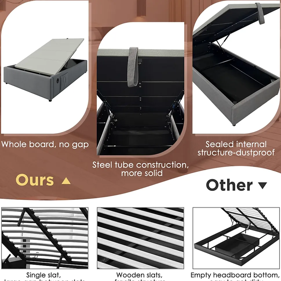 - 【Rangement Pratique avec Hydraulique】 Grâce aux barres hydrauliques ultra-silencieuses, vous pouvez facilement soulever le sommier pour accéder à un espace de rangement généreux sous le lit. Parfait pour ranger des couvertures, coussins et autres articles encombrants.