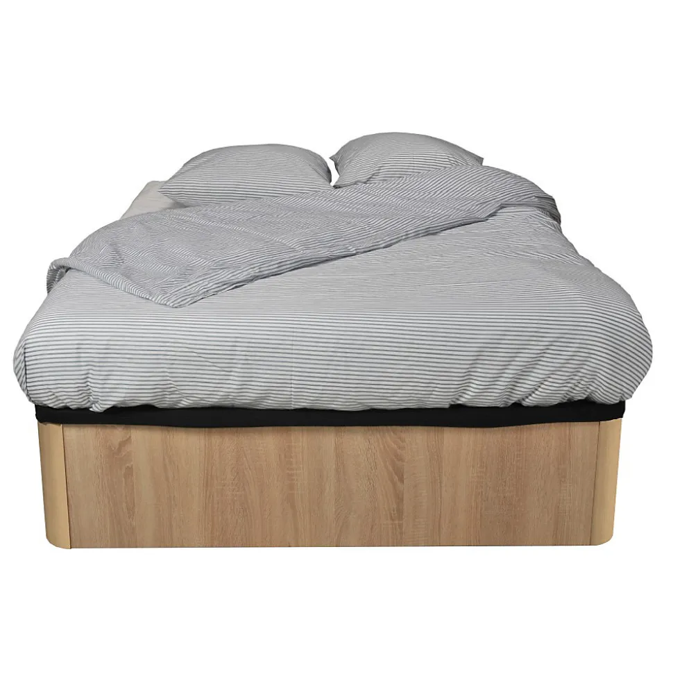 LIT COFFRE 160×200 SPIRO + 1 SOMMIER / Décor Chêne BlanchiOptimisez votre espace tout en offrant une touche d’élégance à votre chambre avec le lit SPIRO 160×200 cm. Les plus produit: – Un design simple mais qui apportera du charme votre chambre grâce à ses finitions en décor chêne blanchi- Facilité d’ouverture du coffre et grande capacité de rangement de 999 litres!Caractéristiques: – Couleur: Décor chêne blanchi- Dimension couchage: 160×200 cm- Dimension coffre: 195.5 x 155.5 x 33cm- Capacité coffre: 999 litres- Fond du coffre en textile- Longueur hors tout: 201cm- Largeur hors tout: 160cm- Hauteur hors tout: 35cm- Matière : panneau de particules + pieds en tilleul massif laqué.- Sommier, cadre et pieds central en tilleul massif et textile noir recouvrant le sommier.- Types de lattes plates : multiplis- Poids maximum du matelas à utiliser : 30 kgLivré démonté et sans matelas, à monter soi-mêmeDimensions: