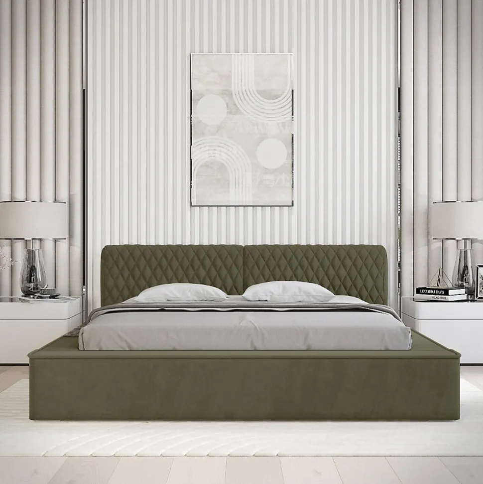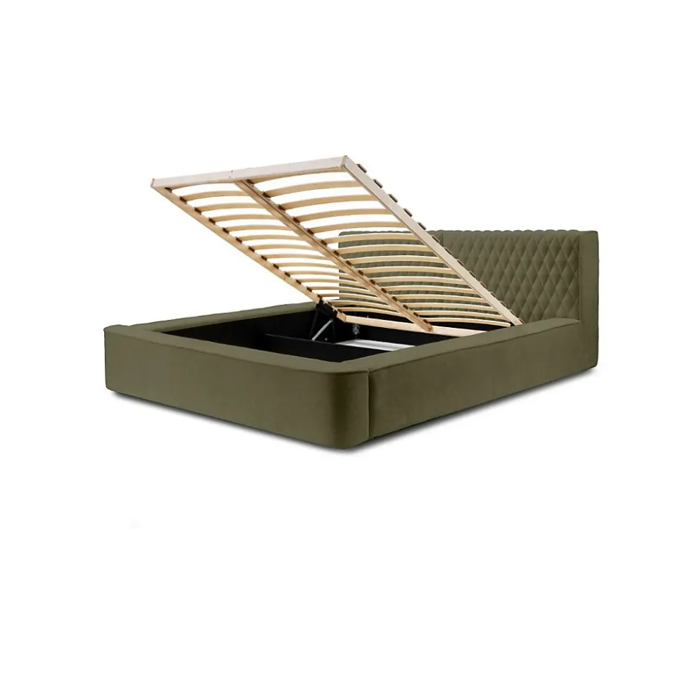 Lit coffre VERNON 140×200 cm en tissu chenille bouclé Feuille d’olivier – Élégance et confort premiumApportez une touche de nature et de sérénité à votre chambre avec le lit coffre VERNON habillé d’un tissu chenille bouclé Feuille d’olivier haut de gamme. Sa texture douce et sa teinte apaisante créent une atmosphère chaleureuse et élégante.Ce lit coffre associe des matériaux nobles — bois massif, métal renforcé et mousse haute densité — pour une robustesse et un confort supérieurs. Son sommier relevable, équipé de lattes en bois massif sur cadre métallique et de vérins à gaz, facilite l’accès à un coffre spacieux, parfait pour optimiser votre rangement.Pourquoi choisir le lit coffre VERNON 140×200 ?Avec ses dimensions généreuses de 238 x 180 x 86 cm, ce lit design combine esthétique haut de gamme et fonctionnalité optimale. Le tissu chenille bouclé premium garantit une excellente résistance et un confort supérieur au quotidien.Caractéristiques techniques premium Type : Lit coffre tapissé avec sommier relevable Collection : VERNON Dimensions couchage : 140×200 cm Dimensions hors-tout : L238 x l180 x H86 cm Structure : Bois massif, métal renforcé, mousse haute densité, panneaux de particules premium Revêtement : Tissu chenille bouclé premium – Coloris Feuille d’olivier Sommier : Lattes bois massif sur cadre métallique avec vérins à gaz haut de gamme Coffre : Grand espace de rangement sécurisé et pratique Pieds : Plastique robuste et discret Nombre de colis : 4 (115 kg)Avantages exclusifs du lit coffre VERNON Design soigné avec finitions haut de gamme Matériaux nobles garantissant durabilité et confort exceptionnel Grand coffre pour un rangement pratique et optimisé Montage facile et rapide (environ 1h49)Découvrez la collection VERNON et explorez notre catégorie Lit pour sublimer votre chambre avec un mobilier haut de gamme.