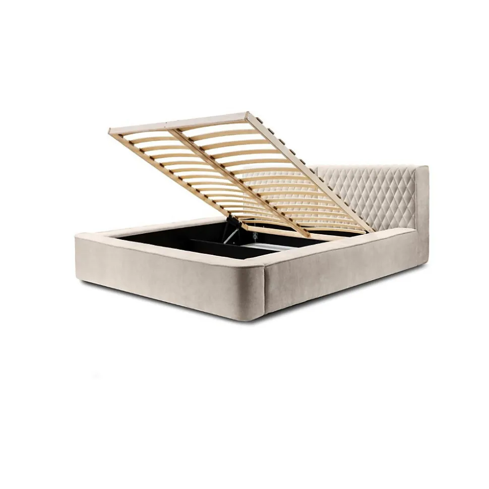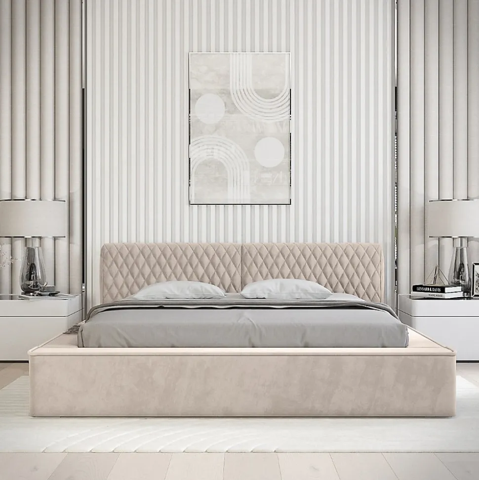 Lit coffre VERNON 140×200 cm en tissu chenille bouclé Sable rosé – Élégance et confort premiumApportez une ambiance douce et chaleureuse à votre chambre avec le lit coffre VERNON habillé d’un tissu chenille bouclé Sable rosé haut de gamme. Sa texture riche et sa teinte délicate créent une atmosphère raffinée et contemporaine.Conçu avec des matériaux nobles — bois massif, métal renforcé et mousse haute densité — ce lit coffre allie robustesse et confort supérieur. Son sommier relevable, équipé de lattes en bois massif sur cadre métallique et de vérins à gaz, offre un accès facile à un coffre spacieux, parfait pour optimiser votre rangement.Pourquoi choisir le lit coffre VERNON 140×200 ?Avec ses dimensions généreuses de 238 x 180 x 86 cm, ce lit design combine esthétique haut de gamme et fonctionnalité optimale. Le tissu chenille bouclé premium garantit durabilité et confort au quotidien.Caractéristiques techniques premium Type : Lit coffre tapissé avec sommier relevable Collection : VERNON Dimensions couchage : 140×200 cm Dimensions hors-tout : L238 x l180 x H86 cm Structure : Bois massif, métal renforcé, mousse haute densité, panneaux de particules premium Revêtement : Tissu chenille bouclé premium – Coloris Sable rosé Sommier : Lattes bois massif sur cadre métallique avec vérins à gaz haut de gamme Coffre : Grand espace de rangement sécurisé et pratique Pieds : Plastique robuste et discret Nombre de colis : 4 (115 kg)Avantages exclusifs du lit coffre VERNON Design soigné avec finitions haut de gamme Matériaux nobles garantissant durabilité et confort exceptionnel Grand coffre pour un rangement pratique et optimisé Montage facile et rapide (environ 1h46)Découvrez la collection VERNON et explorez notre catégorie Lit pour sublimer votre chambre avec un mobilier haut de gamme.