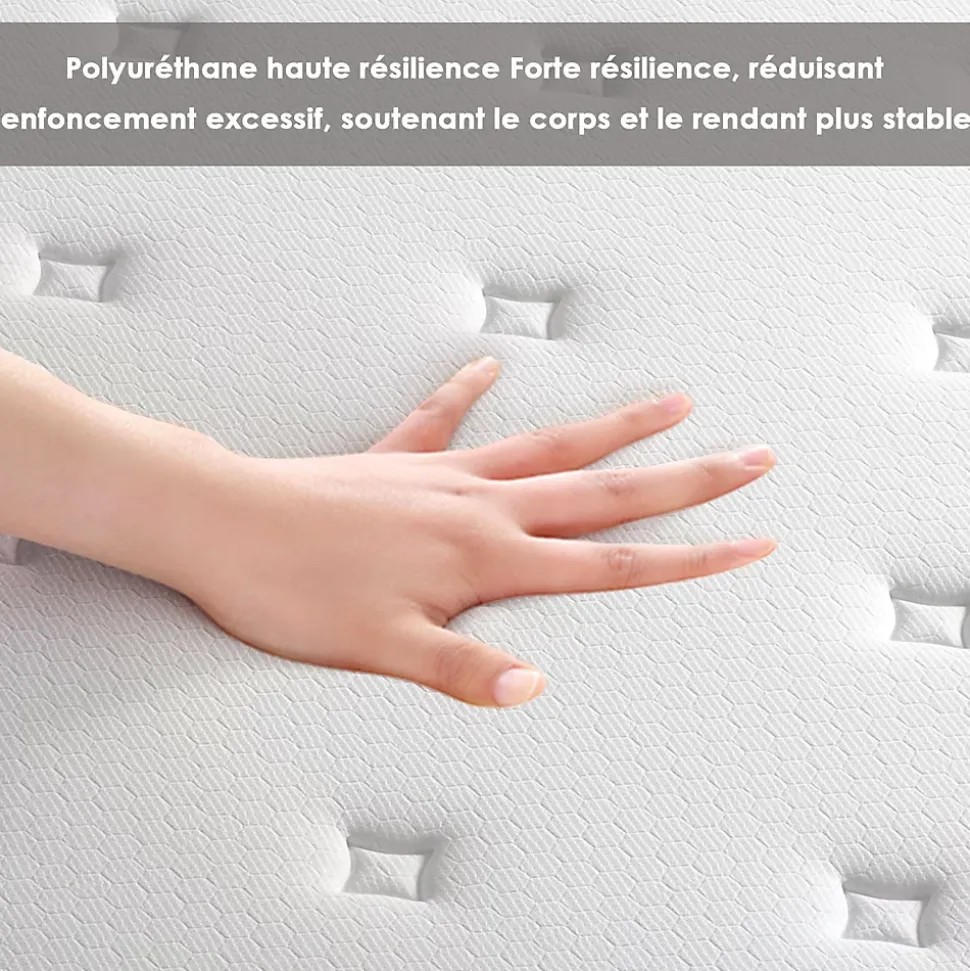 Description du produit:Epaisseur du matelas : 18cm Hauteur des pieds en plastique : 16.5cm Nombre de pieds en plastique : 6 Structure : ① Tissu tricoté : 1cm de mousse matelassée ; 1cm de mousse matelassée bleue ; ② Tissu natif tissé : 1cm de mousse haute densité ; ③ Feutre de coton : 15cm de ressorts ensachés de 1.9mm ; ④ Feutre de coton : Tissu rigide non tissé Bord inférieur : Tissu (Noir 3D+Blanc tricoté) 0.8cm de mousse matelassée Matériau des lattes : Fer