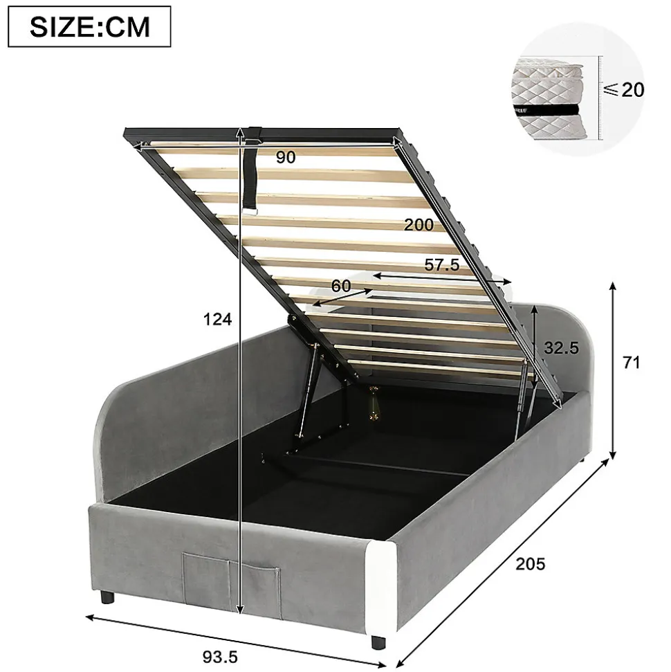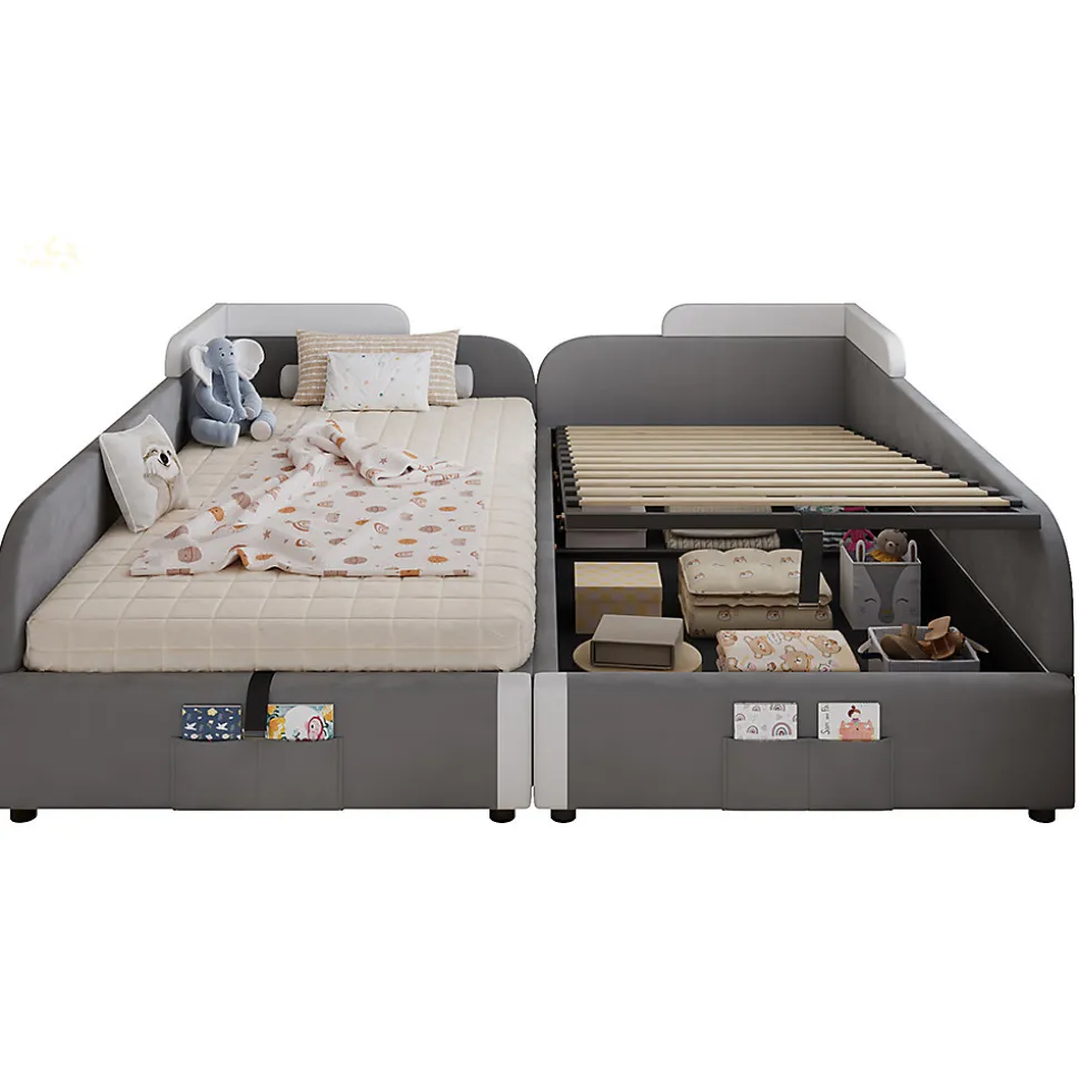 - Solutions de rangement pratiques : en plus de l’espace de rangement hydraulique, il dispose d’un sac de rangement pratique au pied du lit, dans lequel les petits objets tels que les peluches ou les livres d’histoires peuvent être rangés à portée de main. Des poignées supplémentaires facilitent le déplacement ou le réglage du lit.