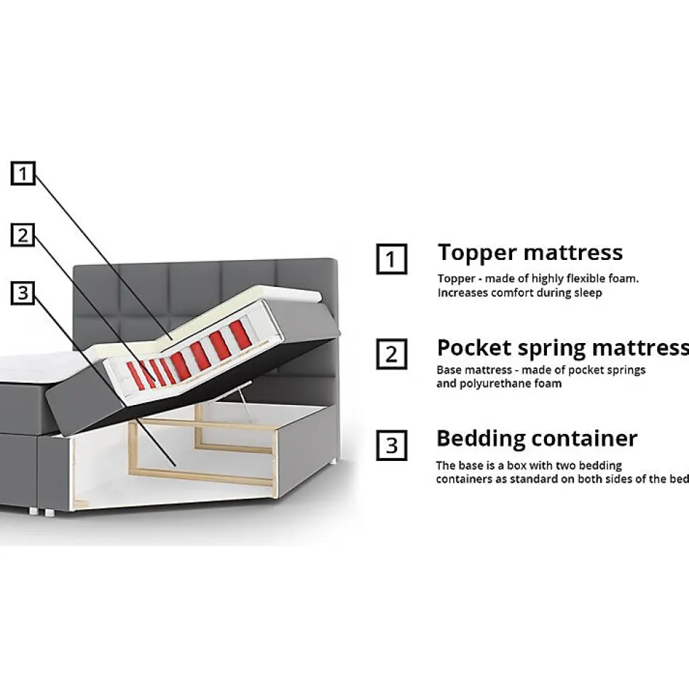 Lit continental Baltimore 115 (Soft 017) Caractéristiques: Largeur: 180 cm; Origine: Union européenne; Sommier à lattes: Disponible; Matelas: Disponible; Boîte de literie: Disponible; Taille du matelas: 1800 x 2000 cm; Hauteur: 130 cm; Longueur: 213 cm; Poids: 177 kg; Capacité de poids maximale: 240 kg; Matériau: Faux cuir; Pieds: Métal; Type de matelas: Avec ressorts (Pocket); Fermeté du matelas: Moyen; Hauteur de la zone de couchage: 67 cm; Matériau du cadre: Stratifié; Matériau du cadre: Bois; Caractéristiques du matelas: Mousse de polyuréthane; Surmatelas: Disponible; Hauteur du pied: 10 cm; Épaisseur du surmatelas: 1.5 cm; Caractéristiques du surmatelas: Mousse de polyuréthane; Caractéristiques du surmatelas: Lavable; Caractéristiques du surmatelas: À deux côtés; Caractéristiques du surmatelas: Antiallergique; Caractéristiques du surmatelas: Antifongique; Caractéristiques du surmatelas: Respirant; Résistance: 68000 Cycles Martindale; Tête de lit: Disponible; Mécanisme de levage: Ressort; Dimensions de la boîte à literie: 33 x 87 x 197cm; Code produit: 112231
