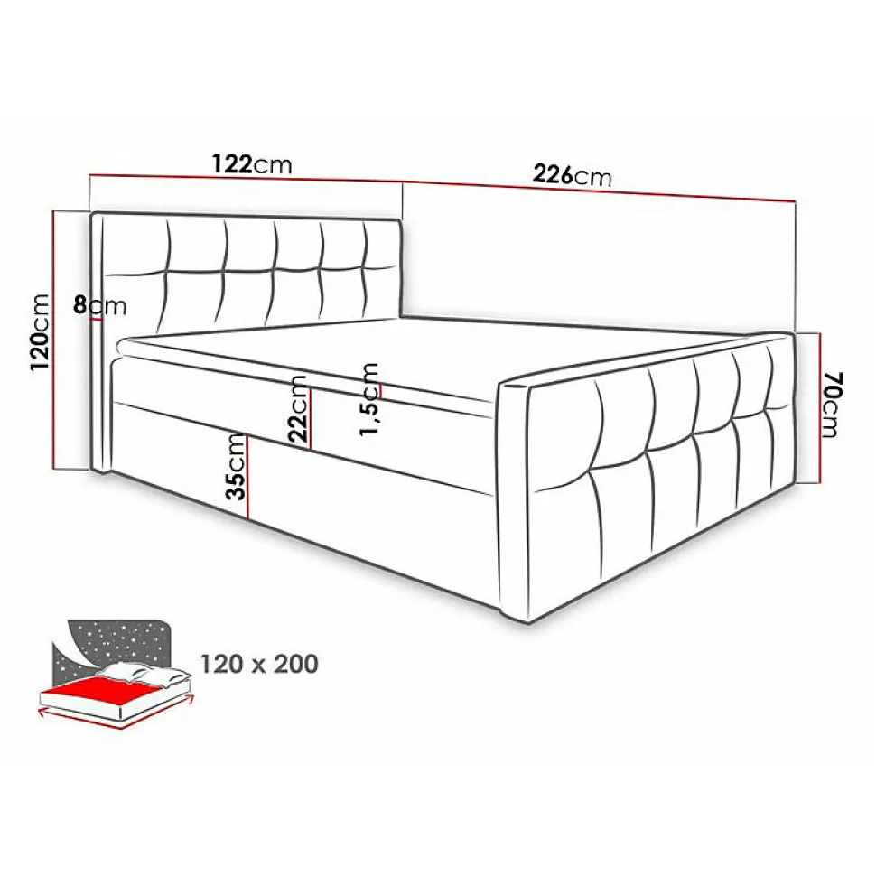 Lit continental Baltimore 138 (Soft 033) Caractéristiques: Largeur: 122 cm; Origine: Union européenne; Sommier à lattes: Disponible; Matelas: Disponible; Boîte de literie: Disponible; Taille du matelas: 1200 x 2000 cm; Hauteur: 120 cm; Longueur: 226 cm; Poids: 149.52 kg; Matériau: Faux cuir; Pieds: Absent; Type de matelas: Avec ressorts (Pocket); Fermeté du matelas: Moyen; Hauteur de la zone de couchage: 58.5 cm; Matériau du cadre: Stratifié; Matériau du cadre: Bois; Caractéristiques du matelas: Mousse de polyuréthane; Surmatelas: Disponible; Hauteur du matelas: 22 cm; Épaisseur du surmatelas: 1.5 cm; Caractéristiques du surmatelas: Mousse de polyuréthane; Caractéristiques du surmatelas: Lavable; Caractéristiques du surmatelas: À deux côtés; Caractéristiques du surmatelas: Antiallergique; Caractéristiques du surmatelas: Antifongique; Caractéristiques du surmatelas: Respirant; Hauteur du cadre: 35 cm; Résistance: 68000 Cycles Martindale; Tête de lit: Disponible; Mécanisme de levage: Ressort; Code produit: 468225