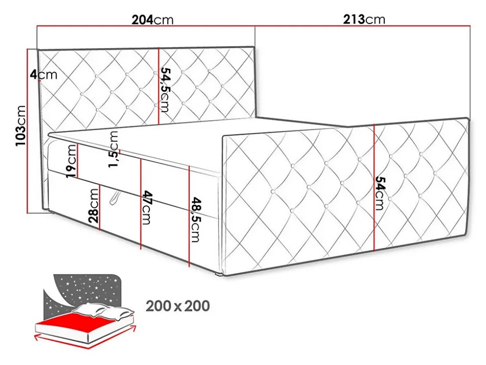 Lit continental Baltimore 158 (Amor Velvet 4303) Caractéristiques: Largeur: 204 cm; Origine: Union européenne; Sommier à lattes: Disponible; Matelas: Disponible; Boîte de literie: Disponible; Taille du matelas: 2000 x 2000 cm; Hauteur: 103 cm; Longueur: 213 cm; Poids: 152 kg; Matériau: Tissu; Pieds: Absent; Type de matelas: Avec ressorts (Bonnell); Fermeté du matelas: Moyen; Hauteur de la zone de couchage: 48.5 cm; Matériau du cadre: Stratifié; Matériau du cadre: Bois; Caractéristiques du matelas: Mousse polyuréthane t25; Surmatelas: Disponible; Hauteur du matelas: 19 cm; Épaisseur du surmatelas: 1.5 cm; Caractéristiques du surmatelas: Mousse de polyuréthane; Caractéristiques du surmatelas: Lavable; Caractéristiques du surmatelas: À deux côtés; Caractéristiques du surmatelas: Antiallergique; Caractéristiques du surmatelas: Antifongique; Caractéristiques du surmatelas: Respirant; Hauteur du cadre: 28 cm; Résistance: 60000 Cycles Martindale; Type de materiau: Velours; Dimensions de la tête de lit: 103 x 204 x 4cm; Tête de lit: Disponible; Mécanisme de levage: Ressort; Dimensions de la boîte à literie: 25 x 197 x 97cm; Code produit: 406689