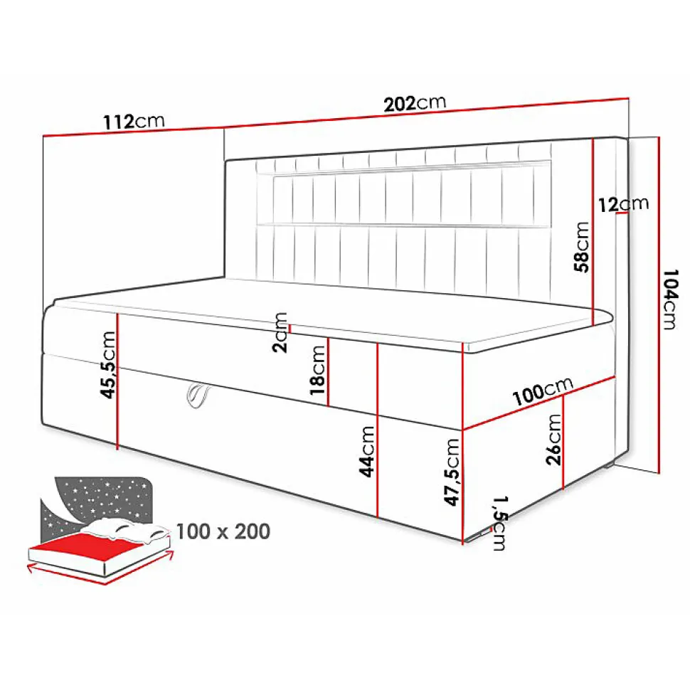 Lit continental Baltimore 168 (Soft 017 + Fresh 8) Caractéristiques: Largeur: 112 cm; Origine: Union européenne; Sommier à lattes: Disponible; Matelas: Disponible; Boîte de literie: Disponible; Taille du matelas: 1000 x 2000 cm; Hauteur: 104 cm; Longueur: 202 cm; Poids: 83 kg; Matériau: Faux cuir; Matériau: Tissu; Pieds: Plastique; Type de matelas: Avec ressorts (Bonnell); Fermeté du matelas: Moyen; Hauteur de la zone de couchage: 49.5 cm; LED: Disponible; Matériau du cadre: Stratifié; Matériau du cadre: Bois; Caractéristiques du matelas: Mousse polyuréthane t25; Surmatelas: Disponible; Hauteur du pied: 2 cm; Hauteur du matelas: 20 cm; Épaisseur du surmatelas: 1.5 cm; Caractéristiques du surmatelas: Lavable; Caractéristiques du surmatelas: À deux côtés; Caractéristiques du surmatelas: Antiallergique; Caractéristiques du surmatelas: Antifongique; Caractéristiques du surmatelas: Respirant; Type de materiau: Velours; Tête de lit: Disponible; Mécanisme de levage: Ressort; Dimensions de la boîte à literie: 25 x 197 x 97cm; Code produit: 470041