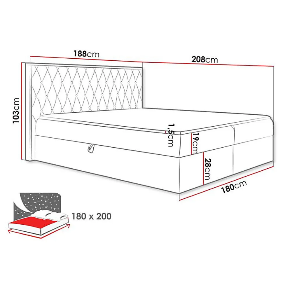 Lit continental Baltimore 190 (Twist 23) Caractéristiques: Largeur: 188 cm; Origine: Union européenne; Sommier à lattes: Disponible; Matelas: Disponible; Boîte de literie: Disponible; Taille du matelas: 1800 x 2000 cm; Hauteur: 103 cm; Longueur: 208 cm; Poids: 130 kg; Matériau: Tissu; Pieds: Plastique; Type de matelas: Avec ressorts (Bonnell); Fermeté du matelas: Moyen; Hauteur de la zone de couchage: 48.5 cm; Matériau du cadre: Stratifié; Matériau du cadre: Bois; Caractéristiques du matelas: Mousse polyuréthane t25; Surmatelas: Disponible; Épaisseur du surmatelas: 1.5 cm; Caractéristiques du surmatelas: Mousse de polyuréthane; Caractéristiques du surmatelas: Lavable; Caractéristiques du surmatelas: À deux côtés; Caractéristiques du surmatelas: Antiallergique; Caractéristiques du surmatelas: Antifongique; Caractéristiques du surmatelas: Respirant; Résistance: 45000 Cycles Martindale; Dimensions de la tête de lit: 57 x 188 x 11cm; Tête de lit: Disponible; Mécanisme de levage: Ressort; Code produit: 495511